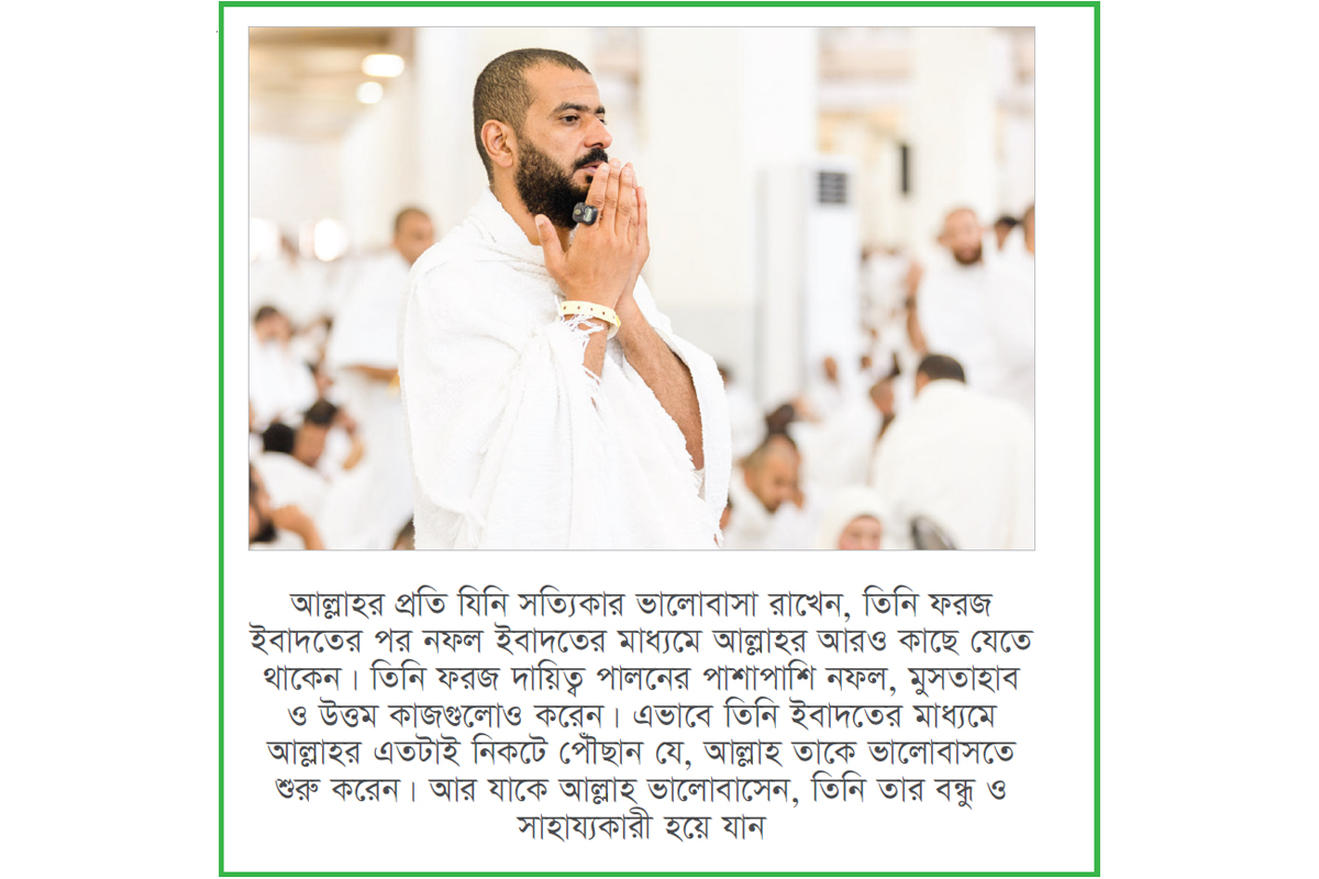 আল্লাহর প্রতি যিনি সত্যিকার ভালোবাসা রাখেন, তিনি ফরজ ইবাদতের পর নফল ইবাদতের মাধ্যমে আল্লাহর আরও কাছে যেতে থাকেন। তিনি ফরজ দায়িত্ব পালনের পাশাপাশি নফল, মুসতাহাব ও উত্তম কাজগুলোও করেন। এভাবে তিনি ইবাদতের মাধ্যমে আল্লাহর এতটাই নিকটে পৌঁছান যে, আল্লাহ তাকে ভালোবাসতে শুরু করেন।
