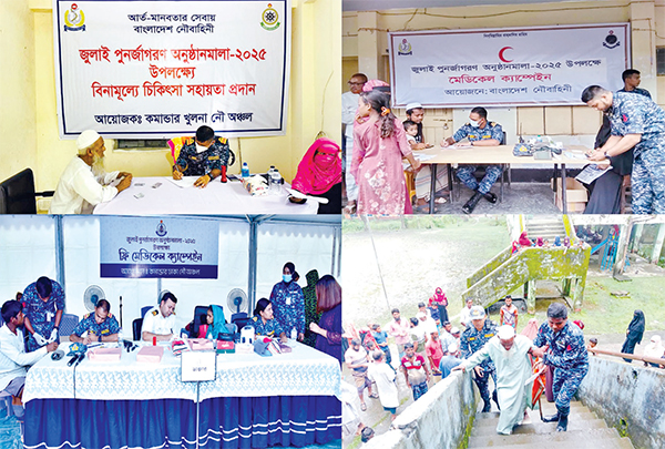 ‘জুলাই পুনর্জাগরণ উৎসব ২০২৫’ উপলক্ষে প্রধান উপদেষ্টার নেতৃত্বে গঠিত জাতীয় কমিটি কর্তৃক দেশব্যাপী বিভিন্ন কর্মসূচি বাস্তবায়িত হচ্ছে। এরই ধারাবাহিকতায় বাংলাদেশ নৌবাহিনীর উদ্যোগে দেশের বিভিন্ন উপকূলীয় ও প্রত্যন্ত অঞ্চলসমূহ এবং ঢাকায় সুবিধাবঞ্চিত জনসাধারণের সুচিকিৎসার জন্য গত সোমবার বিনামূল্যে মেডিকেল ক্যাম্পেইনের আয়োজন করা হয়েছে। কমান্ডার ঢাকা নৌ অঞ্চল এর তত্ত্বাবধানে রাজধানীর ভাষানটেকে আয়োজিত ক্যাম্পে নৌবাহিনীর অভিজ্ঞ চিকিৎসক দল সকাল থেকে দুপুর পর্যন্ত প্রায় পাঁচ শতাধিক নারী, পুরুষ ও শিশুকে চিকিৎসা সেবা ও প্রয়োজনীয় ওষুধ প্রদান করে। এছাড়াও, চট্টগ্রাম নৌ অঞ্চলের অধীনস্থ চট্টগ্রামের আনোয়ারা, পেকুয়া, কুতুবদিয়া, কাপ্তাই ও প্রবাল দ্বীপ সেন্টমার্টিন এ পরিচালিত মেডিকেল ক্যাম্পেইনে কয়েক হাজার অসহায় ও সুবিধাবঞ্চিত মানুষ নৌবাহিনীর অভিজ্ঞ ও যোগ্যতাসম্পন্ন চিকিৎসক দলের কাছে বিনামূল্যে চিকিৎসা সেবা পেয়ে উপকৃত হয়। সূত্র: সংবাদ বিজ্ঞপ্তি