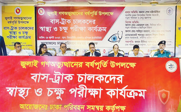 জুলাই গণ-অভ্যুত্থানের বর্ষপূর্তি উপলক্ষে সড়কে মৃত্যু ঠেকাতে রাজধানীতে এক হাজার বাস-ট্রাক চালকের চক্ষু ও স্বাস্থ্য পরীক্ষার উদ্যোগ নিয়েছে ঢাকা পরিবহন সমম্বয় কর্তৃপক্ষ (ডিটিসিএ)। গতকাল মঙ্গলবার সকাল সাড় ৯টার দিকে ঢাকা পরিবহন সমম্বয় কর্তৃপক্ষ, সড়ক পরিবহন ও মহাসড়ক বিভাগ আয়োজিত তেজগাঁও বিআরটিসি প্রশিক্ষণ ইনস্টিটিউটে এ কর্মসূচির উদ্বোধন করা হয়। অনুষ্ঠানের প্রধান অতিথি, প্রধান উপদেষ্টার বিশেষ সহকারী (সড়ক ও সেতু মন্ত্রণালয়) শেখ মইনউদ্দিন এ উদ্বোধন ঘোষণা করেন। রাজধানীর তেজগাঁও এলাকায় তিন দিনব্যাপী এ অনুষ্ঠানের আয়োজন করে ঢাকা পরিবহন সমম্বয় কর্তৃপক্ষ, সড়ক পরিবহন ও মহাসড়ক বিভাগ। বিআরটিসি প্রশিক্ষণ ইনস্টিটিউটে আয়োজিত এ অনুষ্ঠানের বিশেষ অতিথি হিসেবে উপস্থিত ছিলেন, সড়ক পরিবহন ও মহাসড়ক বিভাগের সিনিয়র সচিব মো. এহছানুল হক, স্বাস্থ্য ও সেবা বিভাগের সচিব মো. সাইদুর রহমান, সম্মিলিত পরিষদের প্রধান সমম্বয়কারী অ্যাডভোকেট শামসুর রহমান শিমুল বিশ্বাস, বিআরটিসিএ চেয়ারমান আবদুল লথিফ মোল্লা, পুলিশের অতিরিক্ত ডিআইজি (ট্রাফিক) মো. সরোয়ার প্রমুখ। অনুষ্ঠানের সভাপতিত্ব করেন, ঢাকা পরিবহন সমম্বয় কর্তৃপক্ষ, সড়ক পরিবহন ও মহাসড়ক বিভাগের নীলিমা আখতার। সূত্র : সংবাদ বিজ্ঞপ্তি