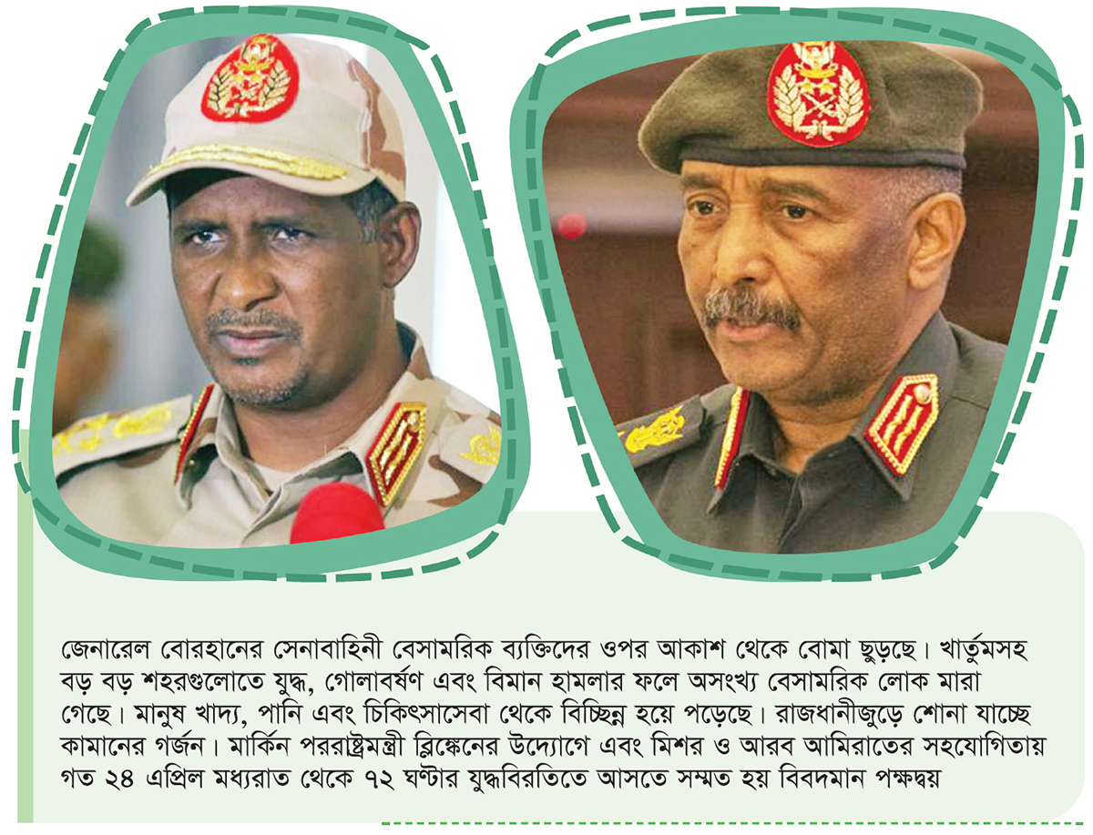 দুই বছর যেতে না যেতেই ফের উত্তপ্ত হয়ে উঠল দীর্ঘদিন ধরেই ‘কনফ্লিক্ট জোন’ বা যুদ্ধাঞ্চল খ্যাত আফ্রিকার অন্যতম বৃহৎ দেশ সুদান। ১৫ এপ্রিল ২০২৩ থেকে শুরু হওয়া এবারের সংঘাতের এক পক্ষে সেনাপ্রধান জেনারেল আবদেল ফাত্তাহ আল বোরহান, অপর পক্ষে আধা সামরিক বাহিনী র্যাপিড সাপোর্ট ফোর্স ‘আরএসএফ’র প্রধান জেনারেল মোহাম্মদ হামদান দাগালো। ২০২১ সালের ২৫ অক্টোবর সামরিক অভ্যুত্থানের মাধ্যমে তদানীন্তন প্রধানমন্ত্রী আবদুল্লাহ হামদুককে গৃহবন্দি ও বেশ কয়েকজন মন্ত্রীকে গ্রেপ্তারের পর জেনারেল বোরহান ও জেনারেল দাগালোর নেতৃত্বাধীন জেনারেলদের একটি কাউন্সিল দেশটি পরিচালনা করতে থাকে। জেনারেল বোরহান সুদানের সশস্ত্র বাহিনীর প্রধান এবং সে কারণে তিনিই দেশটির প্রেসিডেন্ট হন। অন্যদিকে র্যাপিড সাপোর্ট ফোর্সেস বা আরএসএফের কমান্ডার জেনারেল মোহাম্মদ হামদান দাগালো হন দেশটির উপনেতা। বেশ কিছুদিন আগেও তাদের মধ্যে বন্ধুত্ব ছিল। সুদানের প্রেসিডেন্ট ওমর আল বশিরকে ২০১৯ সালে ক্ষমতা থেকে সরাতে তারা দু’জন একসঙ্গে কাজ করেছেন। কিন্তু পরে বিভিন্ন ইস্যুতে তাদের মধ্যে তৈরি হয় ক্ষমতার দ্বন্দ্ব। সুদানের সংশ্লিষ্ট সূত্রের বরাত দিয়ে বিভিন্ন সংবাদমাধ্যম মারফত জানা যায়, মতভেদের মূলে আছে দুই বাহিনীর একীভূতকরণের সময়সীমা, আরএসএফ কর্মকর্তাদের একীভূত বাহিনীতে পদমর্যাদা কী হবে, সে নিয়ে মতানৈক্য এবং আরএসএফের সদস্যরা কী সেনাপ্রধানের আওতায় থাকবেন নাকি কমান্ডার ইন চিফের (বোরহান) আওতায় থাকবেন, সে বিষয়ে দ্বিধা। বেশ কিছুদিন ধরে চলে আসা দ্বন্দ্বে কায়রো বোরহানের নেতৃত্বাধীন সুদানের সশস্ত্র বাহিনীকে সমর্থন জানিয়েছে। অপরদিকে আরব আমিরাত ও রাশিয়ার কাছ থেকে সমর্থন পাচ্ছেন জেনারেল দাগালো। গত ১৪ এপ্রিল ২০২৩ জেনারেল বোরহান আরএসএফকে ‘বিদ্রোহী সংগঠন’ হিসেবে অভিহিত করে সংস্থাটি বিলুপ্ত করে দেয়ার সিদ্ধান্তের কথা জানানোর পরপরই আরএসএফ নেতা দাগালো সেনাপ্রধান বোরহানকে ‘উগ্রপন্থি’ হিসেবে অভিহিত করে তার নেতৃত্বাধীন বাহিনীকে রাজধানী খার্তুমের গুরুত্বপূর্ণ পয়েন্টে মোতায়েন করলে শুরু হয় উভয় পক্ষের মধ্যে যুদ্ধ। সুদানের সেনাবাহিনী আকারে বড় এবং তাদের কাছে যুদ্ধবিমান আছে। তবে আরএসএফ’র সদস্যদের খার্তুম ও অন্যান্য শহরে মোতায়েন করা আছে। আরএসএফ নেতা দাগালো এরই মধ্যে অভিযোগ এনেছেন, জেনারেল বোরহানের সেনাবাহিনী বেসামরিক ব্যক্তিদের ওপর আকাশ থেকে বোমা ছুড়ছে। খার্তুমসহ বড় বড় শহরগুলোতে যুদ্ধ, গোলাবর্ষণ এবং বিমান হামলার ফলে অসংখ্য বেসামরিক লোক মারা গেছে। মানুষ খাদ্য, পানি এবং চিকিৎসাসেবা থেকে বিচ্ছিন্ন হয়ে পড়েছে। রাজধানীজুড়ে শোনা যাচ্ছে কামানের গর্জন। মার্কিন পররাষ্ট্রমন্