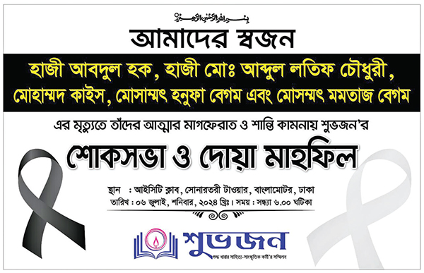 সাম্প্রতিক সময়ে শুদ্ধ ধারার সাহিত্য সাংস্কৃতিক কর্মীদের সম্মীলন ‘ শুভজন’ হারিয়েছে তাদের বেশ ক’জন স্বজনকে। তাদের মধ্যে শুভজনের উপদেষ্টামণ্ডলীর সম্মানিত সদস্য এবং সরকারের অতিরিক্ত সচিব ফয়েজ আহাম্মদের পিতা এবং শুভজনের সম্মানিত সহ-সভাপতি শামীমা নাসরীনের শ্বশুর হাজী আবদুল হক, শুভজনের সম্মানিত সিনিয়র যুগ্ম সাধারণ সম্পাদক আব্দুল মুমিন চৌধুরী জসীমের পিতা হাজী মো. আব্দুল লতিফ চৌধুরী, শুভজনের সম্মানিত প্রতিষ্ঠাকালীন সভাপতি বিশিষ্ট শিশুসাহিত্যিক এম আর মনজুর আদরের দৌহিত্র মো. কাইস, শুভজনের প্রতিষ্ঠাকালীন সদস্য এবং দৈনিক আলোকিত বাংলাদেশের লেখক-পাঠক-শুভানুধ্যায়ীদের সংগঠন বন্ধু ফোরামের বিভাগীয় প্রধান ও কো-অর্ডিনেটর মুহাম্মদ আশরাফ উদ্দিনের মমতাময়ী মাতা মোসাম্মৎ হনুফা বেগম এবং শুভজনের সম্মানিত সাংগঠনিক সম্পাদক সাংবাদিক নাসির উদ্দীন শাহ্ এর নানী মোসাম্মৎ মমতাজ বেগমের মৃত্যুতে গতকাল ৬ জুলাই রাজধানীর বাংলামোটরে অবস্থিত আইসিটি ক্লাবে শুভজন’র উদ্যোগে শোকসভা ও দোয়া মাহফিলের আয়োজন করা হয়েছে। শুভজনের প্রতিষ্ঠাতা ও জাতীয় নির্বাহী পর্ষদের সাধারণ সম্পাদক তরুণ রাসেলের সঞ্চালনায় উপস্থিত শুভজনের জাতীয় নির্বাহী পর্ষদের সদস্য ও কর্মকর্তাগণ শোকসন্তপ্ত পরিবারের প্রতি গভীর শোক ও সমবেদনা প্রকাশ করে বক্তব্য রাখেন।