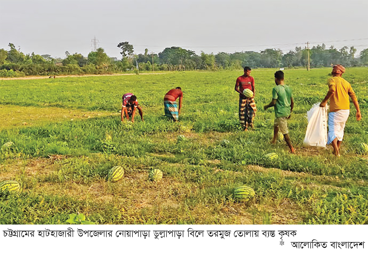 চট্টগ্রামের রাউজান উপজেলার নোয়াপাড়া ইউনিয়নের ডুল্লাপাড়া বিলে এবার প্রায় ১০ হেক্টর (১২০ কানি) জমিতে তরমুজের বিশাল চাষ করে সাড়া ফলেছেন তরমুজ চাষি হাসান। দিগন্তজোড়া সবুজ মাঠ এখন বড় বড় তরমুজে ভরপুর। স্থানীয় কৃষি বিভাগের সহযোগিতায় বরগুনা থেকে আসা একদল উদ্যমী কৃষক এই তরমুজ চাষ করে এলাকায় রীতিমতো কৃষি বিপ্লব ঘটিয়েছেন। তবে মাঝে মধ্যে যেভাবে কাল বৈশাখীর ছোবল ও শীলা বৃষ্টির হচ্ছে রিতিমত সঙ্কায় আছেন তরমুছ চাষিরা। তরমুজ চাষি হাসান জানায়, নোয়াপাড়া ডুল্লাপাড়া বিলের প্রায় ১২০ কানি জমিতে প্রায় ৮৫ থেকে ৯০ হাজার তরমুজের চারা রোপণ করা হয়। এতে খরচ হয় প্রায় ৫০ লাখ টাকা। এই বিশাল কর্মযজ্ঞে সুদূর বরগুনা থেকে আসা অভিজ্ঞ কৃষকরা গত কয়েক মাস ধরে হাড়ভাঙা খাটুনি দিয়ে এই ফসল ফলিয়েছেন। রাউজান উপজেলা কৃষি অধিদপ্তর চাষিদের শুরু থেকেই প্রয়োজনীয় পরামর্শ ও কারিগরি সহযোগিতা দিয়ে আসছে। বর্তমানে ক্ষেত থেকে তরমুজ তোলার উৎসব শুরু হয়েছে। সংগৃহীত তরমুজগুলো ট্রাকে করে স্থানীয় বাজারসহ চট্টগ্রামের বিভিন্ন পাইকারি আড়তে পাঠানো হচ্ছে। আকার ও স্বাদে ভালো হওয়ায় বাজারে এই তরমুজের চাহিদাও বেশ ভালো। সরেজমিনে দেখা গিয়েছে, বিভিন্ন জায়গা হতে মানুষ প্রতিদিন এই বিশাল তরমুজ বাগান দেখতে আসছেন। অনেকে বাগান থেকেই সরাসরি তরমুজ কিনে নিজেরা খাচ্ছেন এবং পরিবারের জন্য হাসিমুখে নিয়ে যাচ্ছেন। চাষিরা জানান, এখন পর্যন্ত আবহাওয়া অনুকূলে থাকায় ফলন আশানুরূপ হয়েছে। যদি আগামী কয়েকদিন আবহাওয়া ঠিক থাকে এবং কোনো প্রাকৃতিক দুর্যোগ না ঘটে, তবে বিনিয়োগের টাকা তুলে বড় অঙ্কের মুনাফা করা সম্ভব হবে বলে তারা আশা করছেন। তারা বলেন, ‘আমরা বরগুনা থেকে এসে এখানে জমি লিজ নিয়ে চাষ করেছি। কৃষি অফিসের সঠিক পরামর্শ পাওয়ায় গাছগুলো বেশ সতেজ ছিল। এখন বাজারদর ভালো পেলে আমাদের পরিশ্রম সার্থক হবে।’ তবে সংখার কথা সম্প্রতি কাল বৈশাখী মাঝে মধ্যে ছোবল আর শীলা বৃষ্টি হওয়া বহু তরমুজও নষ্ট হয়েছে তার পরও আশা বাকী সময়টুকু ঠিক থাকলে লাভের মুখ দেখতে পাব। উপজেলা কৃষি অফিস সূত্রে জানা গেছে, চলতি মৌসুমে রাউজানে মোট ১৮ হেক্টর জমিতে তরমুজ চাষ হয়েছে। এর মধ্যে শুধু নোয়াপাড়া ডুল্লাপাড়া বিলেই চাষ হয়েছে ১০ হেক্টর। এছাড়া রাউজানে অন্যান্য অংশ, হিঙ্গলা, কেউটিয়া গ্রাম এবং রাউজান পৌরসভার পশ্চিম সুলতানপুর, ডাবুয়া, হলদিয়া, বাগোয়ান, কদলপুর এলাকায় তরমুজের চাষ হয়েছে। উপজেলা কৃষি কর্মকর্তা মাসুম কবির এই প্রতিবেদককে জানান রাউজানের মাটি ও জলবায়ু তরমুজ চাষের জন্য বেশ উপযোগী। স্থানীয়দের পাশাপাশি বহিরাগত অভিজ্ঞ চাষিদের এই উদ্যোগ দেখে স্থানীয় বেকার যুবকরাও ভবিষ্যতে তরমুজ চাষে আগ্রহ