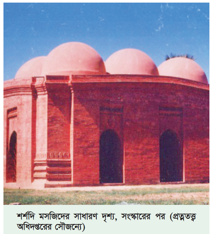 মসজিদটির গাঁথুনিতে চুনের মশলা ও চুনের পলেস্তারা ব্যবহৃত হয়েছে। এ মসজিদের চার কোনায় কোনো বুরুজ না পাওয়ায় সংস্কার কাজের সময় চার কোণায় কোনো বুরুজ নির্মাণ করা হয়নি। স্থাপত্যিক বৈশিষ্ট্য বিবেচনা করে মসজিদটি সুলতানি ও মোগল আমলের অন্তর্বতী কালে নির্মিত বলে ধারণা করা যায়। এই এলাকায় এ মসজিটির অবস্থান গুরুত্ব বহন করে। স্থানীয়ভাবে এটি শের শাহী আমলে নির্মিত বলে প্রচলিত ধারণা রয়েছে। শর্শদি শব্দটি শেরশাহবাদী > শেরশাদী > শর্শদি এভাবে উৎপন্ন হতে পারে। শেরশাহবাদীরা ষোড়শ শতাব্দীর প্রথম দিকে সুলতান শেরশাহের সময় (১৫৩৮-১৫৪৫ খ্রিষ্টাব্দ) এদেশে আগমন করে।
