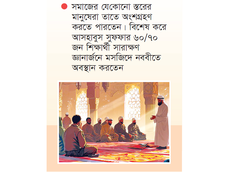 রাসুলুল্লাহ (সা.)-এর অভ্যাস ছিল প্রতিদিন ফজর সালাতের পর তিনি মসজিদে নববির একটা খুঁটির গোড়ায় বসতেন। তার চারপাশে বিভিন্ন সাহাবি, অমুসলিম, যাযাবররা ভিড় জমাতেন। প্রথম প্রথম তারা ছড়িয়ে ছিটিয়ে বসলেও রাসুলুল্লাহ (সা.)-কে কেন্দ্র করে চারপাশে বৃত্তাকারে বসার আদব শিখালেন নবীজি। এরপর শিক্ষার্থীরা বিভিন্ন ধর্মীয় জ্ঞানার্জন করতেন, জীবন ঘনিষ্ঠ প্রশ্নের উত্তর জানতেন, পরামর্শ চাইতেন, নানা বিষয়ে তালিম নিতেন। রাসুলুল্লাহ (সা.)-এর ক্লাস ছিল সবার জন্য উন্মুক্ত। সমাজের যেকোনো স্তরের মানুষেরা তাতে অংশগ্রহণ করতে পারতেন। বিশেষ করে আসহাবুস সুফফার ৬০/৭০ জন শিক্ষার্থী সারাক্ষণ জ্ঞানার্জনে মসজিদে নববীতে অবস্থান করতেন। রাসুলুল্লাহ (সা.)-এর কাছাকাছি থাকতেন। ফলে তাদের প্রত্যেকের মধ্যে তাকওয়া (ভরসা), ইয়াকিন (বিশ্বাস) ও ইলমের (জ্ঞান) ঈমানের অপূর্ব সমন্বয় ছিল। যা অন্য সকল স্টুডেন্ট থেকে তাদের অবস্থান আলাদা করেছিল।