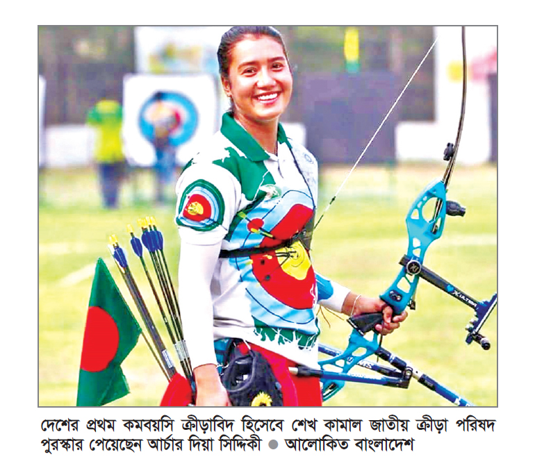 দেশের প্রথম কমবয়সি ক্রীড়াবিদ হিসেবে শেখ কামাল জাতীয় ক্রীড়া পরিষদ পুরস্কার পেয়েছেন আর্চার দিয়া সিদ্দিকী। গতকাল শুক্রবার বঙ্গবন্ধুর জ্যেষ্ঠ পুত্র শহীদ শেখ কামালের ৭৩তম জন্মবার্ষিকীতে, ওসমানী স্মৃতি মিলনায়তনে ভার্চুয়াল প্ল্যাটফর্ম থেকে এ পুরস্কার তুলে দেন প্রধানমন্ত্রী শেখ হাসিনা। নীলফামারীর পাইকপাড়া মধ্য হাড়োয়া এলাকার বাসিন্দা ও বাংলাভিশনের জেলা প্রতিনিধি নূর আলম সিদ্দিকী এবং শাহনাজ বেগম দম্পতির জ্যেষ্ঠ কন্যা দিয়া সিদ্দিকী। তার এ অর্জনে বাবা নূর আলম সিদ্দিকী ভীষণ খুশি। তিনি নীলফামারী জেলা রিপোর্টার্স ইউনিটির প্রতিষ্ঠাতা সভাপতি এবং বাংলাভিশনের জলা প্রতিনিধি। তিনি বলেন, এ অর্জন গোটা নীলফামারীসহ গোটা রংপুর বিভাগের। দিয়া সিদ্দিকী বলেন, আমি পরিবারের বড় মেয়ে। আমার মা কখনোই চাননি, আমি ঘর-সংসারের কাজে মনোযোগ না দিয়ে খেলাধুলা নিয়ে বাড়ির বাইরে সময় কাটাই। খেলাধুলার বিপক্ষে ছিলেন মা; কিন্তু বাবার প্রেরণা আমাকে খেলার সুযোগ করে দিয়েছে, সেই সুযোগ হাতছাড়া করিনি আমি। কঠোর অনুশীলন, ভালো পারফরম্যান্স, মা-বাবা-শিক্ষক-প্রশিক্ষকদের দোয়া আর ভাগ্য- সব মিলিয়েই এ অর্জন। ইসলামিক সলিডারিটি আরচারির আন্তর্জাতিক আসরে দিয়া সিদ্দিকী বাংলাদেশের হয়ে প্রথম স্বর্ণ জয় করেন। জাতীয় আর্চারি দলের অন্যতম সদস্য তিনি। প্রথম আন্তর্জাতিক অভিষেকেই স্বর্ণপদক জয় করে দেশবাসীকে তাক লাগিয়ে দেন দিয়া। এর আগে গত ৪ জুন বাংলাদেশ স্পোর্টস প্রেস অ্যাসোসিয়েশনের বিএসপিএ বর্ষসেরা আর্চারের পুরস্কার পান দিয়া সিদ্দিকী। বর্ষসেরা আর্চারের সঙ্গে বর্ষসেরা ক্রীড়াবিদের পুরস্কারও অর্জন করেছেন তিনি।