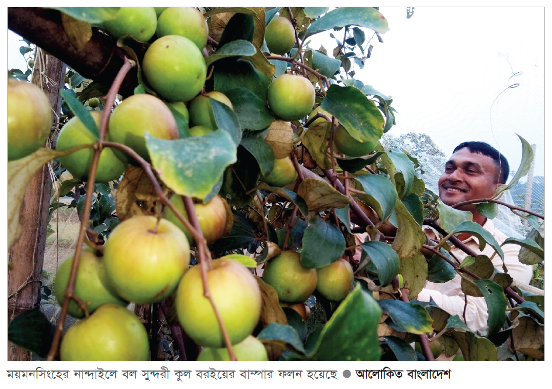 ময়মনসিংহের নান্দাইলের এ বছর বল সুন্দরী কুল বরইয়ের বাম্পার ফলন হয়েছে। ভালো ফলন এবং বাজার দর পেয়ে সাফল্যের হাসি ফুটেছে নান্দাইলের কৃষক মো. রুহুল আমিনের মুখে। তার ৮ মাসের চারা গাছগুলোতে ঝুলছে প্রচুর পরিমাণে বরই। বরইয়ের ভারে নুইয়ে পড়ছে গাছ। সবগুলো গাছে বাঁশ দিয়ে আড়া (মাচা) তৈরি করে দিয়েছেন। এক একটি গাছ ৫ থেকে ৭ ফুট লম্বা হয়েছে। গাছের নিচ থেকে উপর পর্যন্ত থোকায় থোকায় ঝুলছে শুধু বল সুন্দরী কুল। বরইয়ের ওপরের অংশে দেখতে হালকা সিঁদুর রঙ এবং আকারে বেশ বড়। দেখতে যেন ঠিক আপেলের মতো।