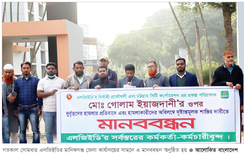 এলজিইডির নির্বাহী প্রকৌশলী এবং চট্টগ্রাম সিটি করপোরেশনের প্রকল্প পরিচালক মো. গোলাম ইয়াজদানীর ওপর দুর্বৃত্তদের হামলার প্রতিবাদ ও হামলাকারীদের দৃষ্টান্তমূলক শাস্তির দাবীতে মানিকগঞ্জে মানববন্ধন অনুষ্ঠিত হয়েছে। গতকাল সোমবার বিকাল ৩টার সময় এলজিইডির মানিকগঞ্জ জেলা কার্যালয়ের সামনে এ মানববন্ধন অনুষ্ঠিত হয়। মানববন্ধনে চট্টগ্র্রাম সিটি করপোরেশনের বিমানবন্দর উন্নয়ন সম্পর্কিত প্রকল্পের প্রকল্প পরিচালক হিসেবে প্রেষণে নিয়োজিত স্থানীয় সরকার প্রকৌশল অধিদপ্তরে নির্বাহী প্রকৌশলী ইঞ্জিনিয়ার মো. গোলাম ইয়াজদানীর ওপর সন্ত্রাসী হামলার তীব্র প্রতিবাদ জানানো হয়। এসময় বক্তারা বলেন, প্রধানমন্ত্রী শেখ হাসিনার নেতৃত্বে সারা দেশের প্রকৌশলীরা দেশের সার্বিক উন্নয়নে নিরলস পরিশ্রম করে যাচ্ছেন। ইঞ্জিনিয়ারদের উপর এরকম নেক্কারজনক হামলা সুষ্ঠুভাবে কর্ম সম্পাদন ও দেশের সার্বিক উন্নয়নের পথে বাধা সৃষ্টি করে। দেশের কাজে নিবেদিত প্রাণ প্রকৌশলীরা যেন নির্বিঘ্নে ও সুষ্ঠুভাবে কাজ করতে পারে, সে জন্য হামলাকারীদের বিচারের আওতায় এনে দৃষ্টান্তমূলক শাস্তি প্রদান করা ও ভবিষ্যতে প্রকৌশলীদের নিরাপত্তা নিশ্চিত করা এখন সময়ের দাবি। মানববন্ধনে উপস্থিত ছিলেন- এলজিইডির সহকারী প্রকৌশলী শাকিল রোখসাইন, উপসহকারী প্রকৌশলী মো. মহিন হোসেন খান, সদর উপজেলার উপসহকারী প্রকৌশলী মো. ইসলাম হোসেন, মো. আমজাদ হোসেন, অত্র দপ্তরের ল্যাব টেকনিশিয়ান, মেকানিক্যাল ফোরম্যান, উচ্চমান সহকারী, অফিস সহকারীসহ সব কর্মকর্তা-কর্মচারী।