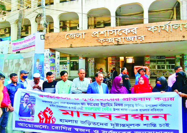 কক্সবাজার জেলা সদর হাসপাতালের ডা. ফাতেমা ইব্রাহিম মিশুর নেতৃত্বে মানববন্ধন অনুষ্ঠিত হয়েছে। উখিয়া উপজেলা পরিষদের ভাইস চেয়ারম্যান বীর মুক্তিযোদ্ধার সন্তান কামরুন নেছা বেবীর উপর হামলার ঘটনায় জড়িতদের দৃষ্টান্তমূলক শাস্তি চেয়ে মানববন্ধন করেছে রোগীর স্বজন ও স্থানীয় এলাকাবাসী। গতকাল শনিবার বিকালে জেলা প্রশাসকের কার্যালয়ের সামনে এ মানববন্ধন কর্মসূচি পালন করা হয়।