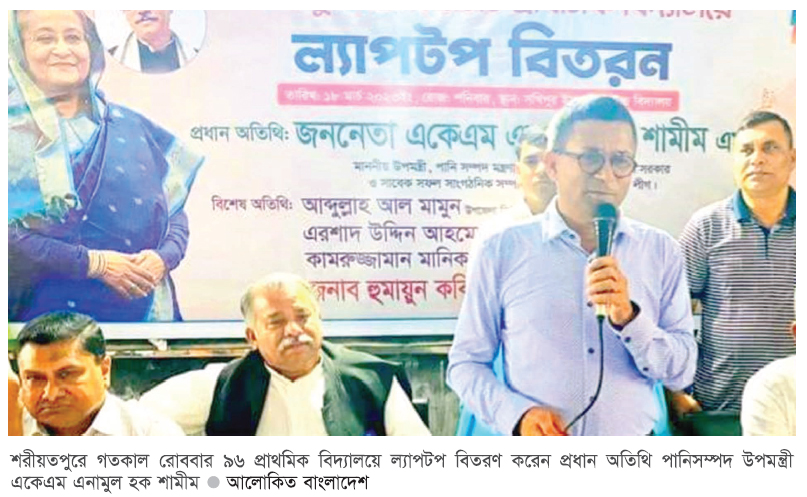 পানিসম্পদ উপমন্ত্রী একেএম এনামুল হক শামীম বলেছেন, নতুন প্রজন্ম হচ্ছে স্মার্ট বাংলাদেশ বিনির্মাণের মূল সৈনিক। তাই তাদের প্রাথমিক থেকেই স্মার্ট বাংলাদেশের নাগরিক হিসেবে গড়ে তুলতে হবে। ডিজিটাল প্রযুক্তির চ্যালেঞ্জ মোকাবিলা করতে না পারলে উন্নয়নের অগ্রযাত্রা অব্যাহত রাখা যাবে না। এজন্য নতুন প্রজন্মকে স্মার্ট নাগরিক হিসেবে গড়ে তোলার বিকল্প নেই। গতকাল রোববার শরীয়তপুরের সখীপুর থানার ৯৬টি প্রাথমিক বিদ্যালয়ে ল্যাপটপ বিতরণ অনুষ্ঠানে প্রধান অতিথির বক্তব্যে তিনি এসব কথা বলেন। এনামুল হক শামীম বলেন, বঙ্গবন্ধুকন্যা প্রধানমন্ত্রী শেখ হাসিনার ঘোষিত ডিজিটাল বাংলাদেশ এখন দৃশ্যমান। ডিজিটাল বাংলাদেশের সফলতার পর স্মার্ট বাংলাদেশের যাত্রা শুরু হয়েছে। বঙ্গবন্ধুকন্যা শেখ হাসিনা শুধু স্বপ্ন দেখায় না, স্বপ্ন বাস্তবে রুপ দান করে। উপমন্ত্রী বলেন, শেখ হাসিনা প্রাথমিক শিক্ষা থেকে শুরু করে বিশ্ববিদ্যালয় পর্যন্ত বিশ্বমানের করার জন্য কাজ করে চলছেন। উপজেলা শহরে থাকা মাধ্যমিক শিক্ষা প্রতিষ্ঠানকে সরকারিকরণ করছে। তিনি প্রতিটি শিক্ষা প্রতিষ্ঠানে শেখ রাসেল ডিজিটাল ল্যাব স্থাপন করেছেন। নতুন নতুন ভবন করে দিচ্ছেন। তিনি দেশের কৃষি শিক্ষা ও তথ্যপ্রযুক্তির ওপর বিশেষ গুরুত্ব দিচ্ছেন। জেলায় জেলায় বিশ্ববিদ্যালয় গড়ে তুলছেন। প্রধানমন্ত্রীর কারণেই বছরের প্রথম দিনে সকল শিক্ষার্থীরা বিনামূল্যে বই পায়। বই উৎসব হয়। শরীয়তপুরেও একইভাবে শিক্ষাক্ষেত্রে ব্যাপক উন্নয়ন হচ্ছে। নড়িয়া-সখীপুরে সকল ননএমপিওভুক্ত স্কুল কলেজ এমপিওভুক্ত হয়েছে। অবকাঠামোগত ও শিক্ষার মান আগের চেয়ে বহুগুণ বেড়েছে। ভেদরগঞ্জ উপজেলা চেয়ারম্যান হুমায়ুন কবির মোল্যার সভাপতিত্বে সভায় বক্তব্য দেন জেলা আওয়ামী লীগের সভাপতি ছাবেদুর রহমান খোকা সিকদার, জেলা পরিষদের প্যানেল চেয়ারম্যান এমএ কাইয়ুম, আওয়ামী লীগের কেন্দ্রীয় উপকমিটির সদস্য জহির সিকদার, ভেদরগঞ্জ উপজেলা নির্বাহী কর্মকর্তা আব্দুল্লাহ আল মামুন, জেলা প্রাথমিক শিক্ষা কর্মকর্তা এরশাদ উদ্দিন আহমেদ, সখীপুর ইউপি চেয়ারম্যান কামরুজ্জামান মানিক সরদার প্রমুখ।