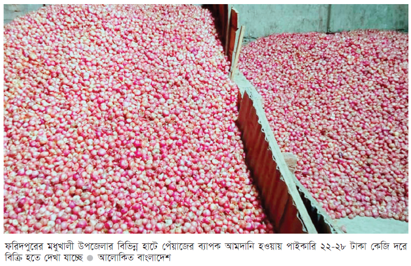 ফরিদপুরের মধুখালী উপজেলার বিভিন্ন হাটে পেঁয়াজের ব্যাপক আমদানি হওয়ায় এবার পাইকারি ২২-২৮ টাকা কেজি দরে পেঁয়াজ বিক্রি হতে পদখা যাচ্ছে। উপজেলার মধুখালী সদর সবচেয়ে বড় বাজার গত শুক্রবার ও সোমবার দুইদিন হাট ছাড়াও প্রতিদিন পেঁয়াজের হাট মেলে। এ হাটে উপজেলার বাগাট, কোরকদী, মেগচামী, বামুন্দী, জাহাপুর, বোয়ালিয়া, কামালদিয়াসহ বিভিন্ন ইউনিয়ন থেকে পেঁয়াজ চাষিরা হাটে পেঁয়াজ নিয়ে উপস্থিত হন। গতকাল শুক্রবার ও সোমবার পেঁয়াজের আমদানি হয় অনেক বেশি। পেঁয়াজের উপস্থিতির কারণে ঢাকা-খুলনা মহাসড়কে দীর্ঘ যানজটের সৃষ্টি হয়। গত বছরের তুলনায় ঠিক এ সময় পেঁয়াজের দর মোটামুটি। তবে পেঁয়াজ আমদানি প্রচুর। মৌসুমে প্রতি হাটে মধুখালী থেকে ২৫ থেকে ৩০ জন আড়ৎদারের ঘর থেকে প্রায় ৯৫ হাজার মণ পেঁয়াজ রাজধানী ঢাকা, বরিশাল, খুলনাসহ বিভিন্ন জেলার ব্যাপারীরা খরিদ করে নিয়ে যায়। প্রতি মণ লাল তীর পেঁয়াজ ৯০০ টাকা আর দেশি পেঁয়াজ ১১০০ টাকা পর্যন্ত পাইকাররা কিনছেন। যা খুচরা বাজারে ৩০ থেকে ৩৫ টাকা দরে বিক্রি করছেন ব্যবসায়ীরা। বাজারে পেঁয়াজ বিক্রি করতে আসা একাধিক কৃষক বলেন, যে দামে বিক্রি করছি তাতে আমাদের কৃষি কাজ করে জীবন চালানো কষ্টকর। যেখানে মণপ্রতি খরচ করেছি ১হাজার থেকে ১১শ টাকা তা পাচ্ছি না। বেশি দাম পাওয়ার আশায় অনেক কৃষক তাদের পেঁয়াজ নিয়ে বাড়ি ফিরতে দেখা যায়। চরবাগাট গ্রামের কৃষক মো. মাসুদ মৃধা বলেন, কৃষক পেঁয়াজের দাম পায়না। গতবছর পেঁয়াজে প্রায় ৫০ হাজার টাকা লোকসান হয়। এ বছর আশা করে পেঁয়াজ চাষ করি এখন পর্যন্ত মুড়িকাটা পেঁয়াজে লোকসান হয়েছে। লাভের আশা নেই তবে কৃষকের লাভ প্রয়োজন। তিনি জানান, প্রতি শতাংশ জমিতে প্রায় ১৮৫০ টাকা খরচ হয়েছে। প্রতি শতাংশে পেঁয়াজ উৎপাদন হয় দুইমন। বাজারে বর্তমান দামে লোকসান না হলেও লাভ চোখে পড়ছে না। উপজেলা কৃষি অফিসার আলভীর রহমান জানান, চলতি ২০২২-২০২৩ মৌসুমে মধুখালীতে মোট মুড়িকাটা, দানা এবং হালিসহ সব মিলিয়ে ৩ হাজার ২৪০ হেক্টর জমিতে পেঁয়াজ আবাদ হয়েছে।