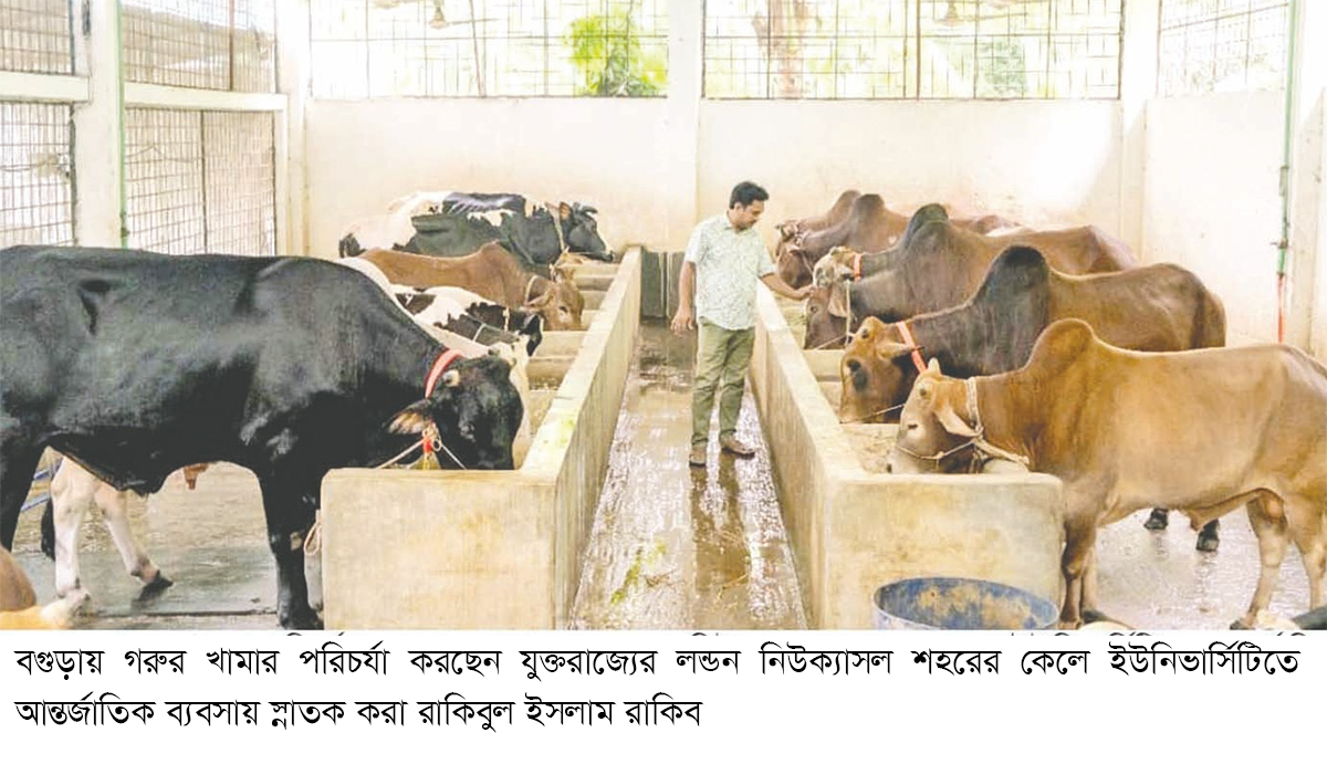 শিক্ষিত ও সফল উদ্যোক্তা রাকিবুল ইসলাম রাকিব জানান, নিউজিল্যান্ড থেকে পড়ালেখা করে বগুড়ার তৌহিদ পারভেজ বিপ্লব, লন্ডন ফেরত আতিফা এগ্রোর প্রধানকর্তা আব্দুর রহমান খামারি হিসেবে নিজেদের দাঁড় করিয়েছেন। তাদের পাশে গিয়ে তিনি প্রতিনিয়ত শিখছেন। সেই সঙ্গে বগুড়া সদর উপজেলা প্রাণিসম্পদ কর্মকর্তা আব্দুস সামাদ তাকে বিভিন্ন বিষয়ে সহযোগিতা করে যাচ্ছেন। তিনি প্রতিনিয়ত সহযোগিতার হাত বাড়িয়ে রেখেছেন। ছোট ভাই শাহারিয়ারসহ বাবা-মা, স্ত্রী সন্তানদেরও সহযোগিতা রয়েছে। তিনি বিদেশে লেখাপড়া করার সময় সে দেশের কৃষি ফার্ম পরিদর্শন করে জ্ঞান অর্জন করেন। সেটি তিনি দেশে ফিরে কাজে লাগান। লেখাপড়া করে চাকরি পাওয়া একমাত্র লক্ষ্য হতে পারে না। ছোট্ট দেশে এত চাকরি কি করে দেবে, নিজেকে গড়তে হবে উদ্যোক্তা হিসেবে। উৎপাদনমুখী দেশ হলে চাকরিই জনবলকে ডাকবে। এসব চিন্তা করেই সূরা এগ্রো ফার্ম গড়েন। এই ফার্মে অর্ধশত গরু রয়েছে। সব মিলিয়ে ১৭ জন শ্রমিক রয়েছে। মাংসের জন্য গরু আর দুধ থেকে পুষ্টিমানের দুগ্ধজাতীয় খাবার তৈরি করা হচ্ছে। এবার কোরবানির গরু বিক্রি হবে প্রতি কেজি ৫০০ থেকে ৬০০ টাকা। আস্ত গরু ওজন মেশিনে তুলে মেপে নিতে হয়। গত বছর প্রতি কেজি বিক্রি হয়েছে ৪৫০ থেকে ৫০০ টাকা। এবছর গরুর খাবারের দাম বেড়েছে দ্বিগুণ। খামারিদের জন্য বড় সমস্যা গরুর খাবার ও ওষুধ। ‘শুধু গরুর খামারের আয় থেকে লাভ করা কঠিন। তাই মাংস উৎপাদনের পাশাপাশি দুধের খামার গড়া হয়েছে। তিনি বলেন, বিদেশ থেকে ফিরে গরুর ফার্ম গড়বেন এমনটা ভাবেননি। কিন্তু শৈশবের চিন্তাটিই ঘুরে ফিরে আসে। ফার্ম গড়ার পর অনেক যুবকই তার ফার্ম বিষয়ে জানতে আসেন। গরু ও খামার গড়ার বিষয়টি জেনে যান।