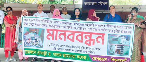 সিরাজগঞ্জের কামারখন্দ উপজেলার জামতৈল কলেজপাড়া গ্রামের শিক্ষিকার ভাড়াটিয়া বাসায় দুঃসাহসিক চুরির ঘটনায় মালামাল উদ্ধার ও চোরকে গ্রেপ্তারের দাবিতে মানববন্ধন করা হয়েছে। উপজেলার চৌবাড়ী ড. সালাম জাহানারা কলেজের শিক্ষকমন্ডলী গতকাল বুধবার সকালে জামতৈল রেল স্টেশনে এ মানববন্ধন করেন। এ মানববন্ধনে বক্তব্য রাখেন, কলেজ শিক্ষক আব্দুস সালাম, নাছিমা রহমান চৌধুরী, আব্দুল লতিফ, আলপনা ভৌমিক, সাজেদা সিদ্দিকা, আব্দুল মমিন প্রমুখ। বক্তারা বলেন, এ দুঃসাহসিক চুরির ঘটনার কয়েক সপ্তাহ পার হলেও সংশ্লিষ্ট প্রশাসন এখনও ব্যবস্থা নেয়নি। চুরি যাওয়া মালামাল উদ্ধারসহ জড়িতদের গ্রেপ্তারের দাবি জানান। উল্লেখ্য, কলেজের শিক্ষিকা কবি শীলা প্রামানিকের ওই ভাড়া বাসায় গত ২৬ জুন দুপুরের দিকে গ্রিল কেটে ও দরজা ভেঙে নগদ টাকাসহ প্রায় ৩০ লাখ টাকার স্বর্ণালংকর চুরি হয়।