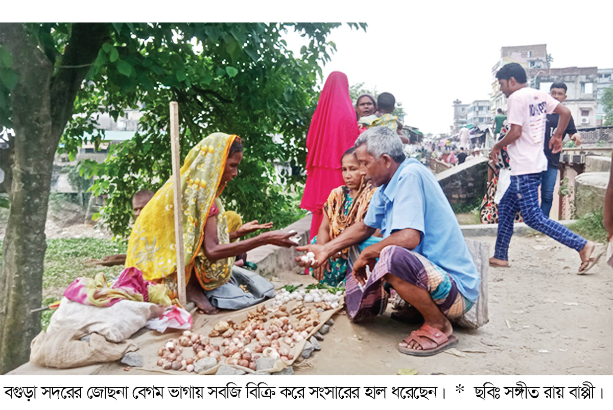 বগুড়া সদরের নারুলী তালপট্টি এলাকার জোছনা বেগম (৬০) দুই দশক ধরে রেললাইনের পাশে ভাগা করে সবজি বিক্রি করে। ছয়জন সদস্যের সংসারে অভাবে কেটে যায় দিন। দিন যায় মাস যায় তবুও অভাবটা শেষ হয় না।