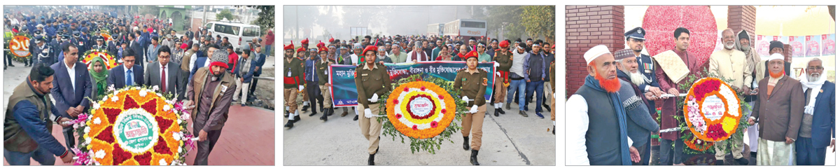 শেরপুর : জেলা প্রশাসন, পুলিশ প্রশাসন, জেলা বিএনপিসহ নানা পেশার মানুষ শহীদ মুক্তিযোদ্ধার স্মৃতিস্তম্ভে পুষ্পস্তবক করেন। পরে জেলা বিএনপির আহ্বায়ক হজরত আলীর সভাপতিত্বে সংক্ষিপ্ত সমাবেশে বক্তব্য রাখেন জেলা বিএনপির আহ্বায়ক হযরত আলী। এ সময় আরো বক্তব্য রাখেন- সদস্য সচিব অ্যাড. সিরাজুল ইসলাম, যুগ্ম আহ্বায়ক আওয়াল চৌধুরী, শহর বিএনপির সভাপতি, মামুনুর রশীদ পলাশ প্রমুখ। এ ছাড়া জেলা শিল্পকলা একাডেমিতে আলোচনা সভা ও বিজয় মেলা অনুষ্ঠিত হয়।