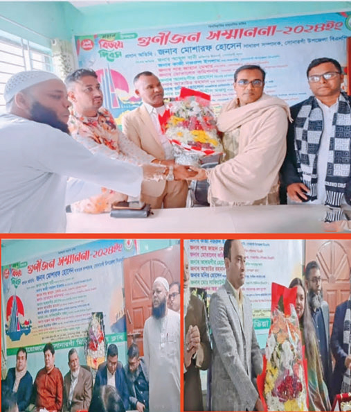 নারায়ণগঞ্জের সোনারগাঁওয়ে মহান বিজয় দিবস ১৬ ডিসেম্বর উপলক্ষে মিডিয়া প্রেস ক্লাব কর্তৃক আয়োজিত গুণিজন সম্মাননা অনুষ্ঠান ২০২৪ ইং অনুষ্ঠিত হয়েছে। গত শনিবার ইব্রাহিম খলিলের সভাপতিত্বে ও সামির সরকার সবুজের সঞ্চালনায় মোগরাপাড়া চৌরাস্তা আল-মদিনা শপিং কমপ্লেক্সের ৫ম তলায় সোনারগাঁ মিডিয়া প্রেস ক্লাবে এ সম্মাননা অনুষ্ঠান অনুষ্ঠিত হয়। অনুষ্ঠানে শিক্ষা, স্বাস্থ্য সামাজিক উন্নয়ন সহ সমাজে বিভিন্ন ক্ষেত্রে বিশেষ ভূমিকা রাখায় ব্যক্তিদের সোনারগাঁও মিডিয়া প্রেসক্লাবের পক্ষ থেকে গুণিজন সম্মাননা ক্রেস্ট প্রদান করা হয়। এসময় প্রধান অতিথি হিসেবে উপস্থিত ছিলেন- উপজেলা বিএনপির সাধারণ সম্পাদক মোশারফ হোসেন। বিশেষ অতিথি হিসেবে উপস্থিত ছিলেন- সোনারগাঁও থানার ওসি মোহাম্মদ আবদুল বারী, সনমান্দি ইউনিয়ন বিএনপির সভাপতি ছাফিরউদ্দীন মজনু, সোনারগাঁ মিডিয়া প্রেস ক্লাবের সহসভাপতি হাবিব মাস্টার, সোনারগাঁ পরিবেশ উন্নয়ন সোসাইটির সভাপতি মো. হোসাইন, সোনারগাঁও রিপোর্টার্স ক্লাবের সাধারণ সম্পাদক ও দৈনিক আলোকিত বাংলাদেশ পত্রিকার সোনারগাঁও প্রতিনিধি শফিকুল ইসলাম। অনুষ্ঠানে প্রধান অতিথির বক্তব্যে উপজেলা বিএনপি’র সাধারণ সম্পাদক মোশারফ হোসেন সোনারগাঁও মিডিয়া প্রেস ক্লাবের এ উদ্যোগকে সাধুবাদ জানিয়ে বলেন এ সম্মাননা ব্যক্তি বা প্রতিষ্ঠানকে আরো উৎসাহিত করবে। এ ধরনের অনুষ্ঠান ভবিষ্যতেও চালিয়ে নেয়ার অনুরোধ করেন তিনি।