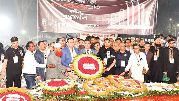 মহান শহীদ দিবস ও আন্তর্জাতিক মাতৃভাষা দিবস উপলক্ষে কেন্দ্রীয় শহীদ মিনারে ভাষা আন্দোলনে শহীদদের প্রতি শ্রদ্ধা জানিয়েছেন জাতীয় বিশ্ববিদ্যালয়ের উপাচার্য অধ্যাপক ড. এ এস এম আমানুল্লাহ। গত শুক্রবার মধ্যরাতে উপাচার্যের নেতৃত্বে বিশ্ববিদ্যালয়ের বিভিন্ন স্তরের শিক্ষক, কর্মকর্তা, শিক্ষার্থী ও কর্মচারী শহীদ মিনারে ফুল দিয়ে শ্রদ্ধা জানান। এ সময় উপাচার্যের সঙ্গে বিশ্ববিদ্যালয়ের উপ-উপাচার্য অধ্যাপক লুৎফর রহমান, উপ-উপাচার্য অধ্যাপক ড. মো. নূরুল ইসলাম, ট্রেজারার অধ্যাপক ড. এ টি এম জাফরুল আযম, বিভিন্ন অনুষদের ডিন (ভারপ্রাপ্ত), রেজিস্ট্রার, পরীক্ষা নিয়ন্ত্রকসহ বিশ্ববিদ্যালয়ের বিভিন্ন দপ্তরের বিভাগীয় প্রধান, শিক্ষক, কর্মকর্তা, শিক্ষার্থী ও কর্মচারীরা উপস্থিত ছিলেন।