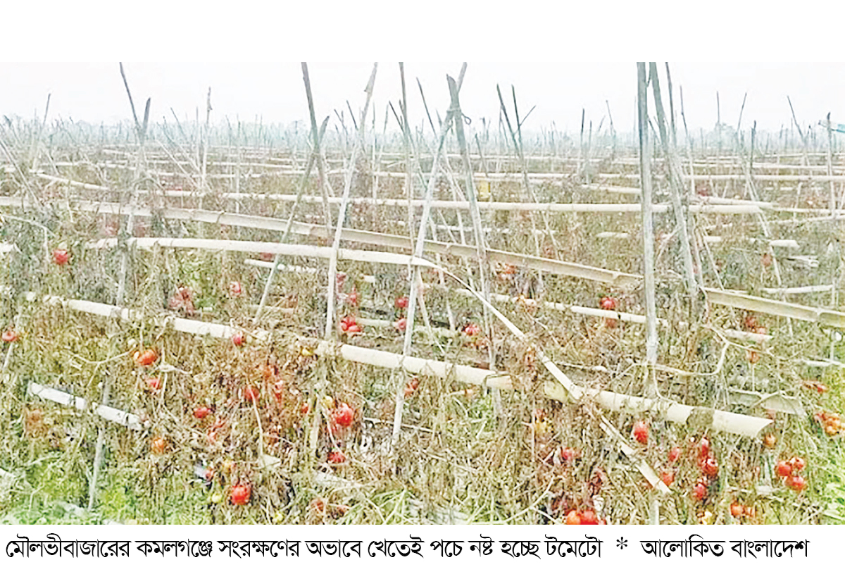 না হলে ফসল পচে নষ্ট হয়ে যাবে। বর্তমানে টমেটোর চাষের বাজারজাত করনের শেষ সময় চলছে। বাজারে পাইকারি মূল্য ৭-৮ টাকা। খুচরা বাজারে তা বিক্রি হচ্ছে ২০ টাকায়। মজুরি ও পরিবহন খরচ না উঠায় চাষিরা খেত থেকে টমেটো তুলতে চাইছেন না। ফলে খেতেই টমেটো বিনষ্ট হচ্ছে। কিন্তু মাসখানেক পরই সেই টমেটো ৪০ থেকে ৫০ টাকা কেজি দামে বিক্রি হবে। কমলগঞ্জ উপজেলা কৃষি অফিস সূত্রে জানা যায়, উপজেলার মাধবপুর, আলীনগর, আদমপুর, সদর ইউনিয়ন ও পৌর এলাকার তিলকপুর, হোমেরজান, পাত্রখোলা, জামিরকোনা, কাটাবিল, নাজাতকোনা, ধলাই পার, নরেন্দ্রপুর, আদমপুর ও ইসলামপুর, ছয়ছিড়িসহ বিভিন্ন গ্রামে প্রায় ৩৫ হেক্টর জমিতে গ্রীষ্মকালীন টমেটো চাষাবাদ হয়েছে। তবে গ্রাফটিং পদ্ধতিতে কেউ কেউ বারো মাসও টমেটো চাষাবাদ করেন। কমলগঞ্জ সদর ইউনিয়নের রাজারগাঁও গ্রামের সবজি চাষী সাইদুল ও রাজ্জাক বলেন, স্থানীয় বেপারীরা কমলগঞ্জ থেকে স্বল্প দামে কৃষকের শস্য কিনে ট্রাকে করে দেশের অন্যান্য এলাকায় নিয়ে বেশি দামে বিক্রি করছে। এতে স্থানীয় কৃষকরা লাভবান হচ্ছে না। কৃষকের ভাগ্যের উন্নয়নে স্থানীয় ভাবে এখানে একটি হিমাগার স্থাপন করার জন্য দীর্ঘদিন থেকে প্রশাসনের কাছে দাবি জানিয়ে আসছি। কিন্তুু কেউ কথা রাখছেন না।