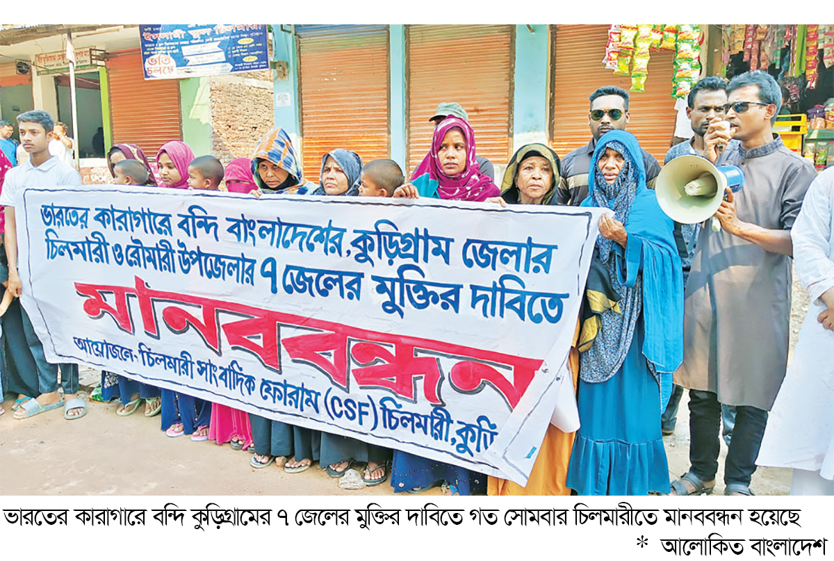 ভারতের কারাগারে বন্দি কড়িগ্রামের ৭ জেলের মুক্তির দাবিতে জেলার চিলমারীতে মানববন্ধন অনুষ্ঠিত হয়েছে। গত সোমবার এ মানববন্ধন অনুষ্ঠিত হয়।