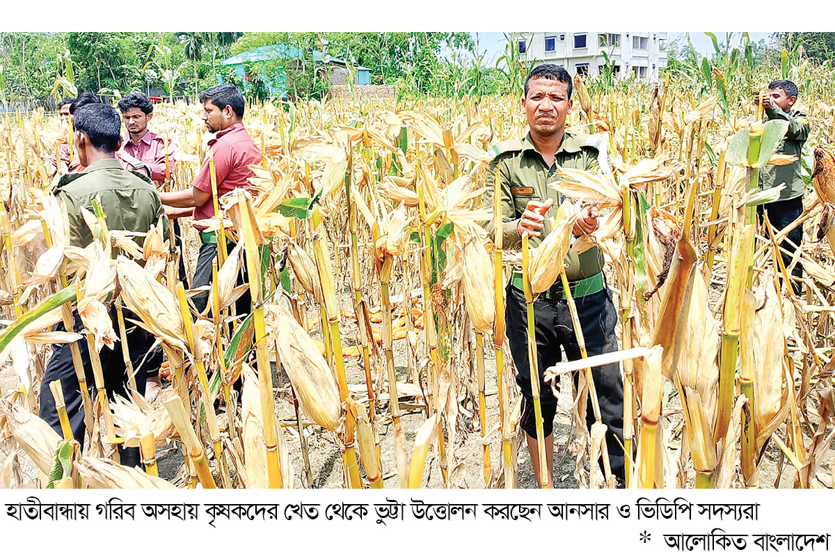 লালমনিরহাটের হাতীবান্ধায় কৃষকের বর্তমানে প্রধান অর্থকারী ফসল ভুট্টা। শুরু হয়েছে চলতি মৌসুমের ভুট্টা উঠানোর কাজ। একদিকে প্রাকৃতিক দুর্যোগ অপরদিকে ভুট্টা উঠানোর শ্রমিকের সংকটে হওয়ায় বিপাকে পড়েছেন দরিদ্র কৃষকরা। এমন পরিস্থিতিতে গরিব কৃষকদের খেত থেকে ভুট্টা উত্তোলন করে দিচ্ছেন হাতীবান্ধা উপজেলার কর্মরত আনসার ও ভিডিপি সদস্যরা।