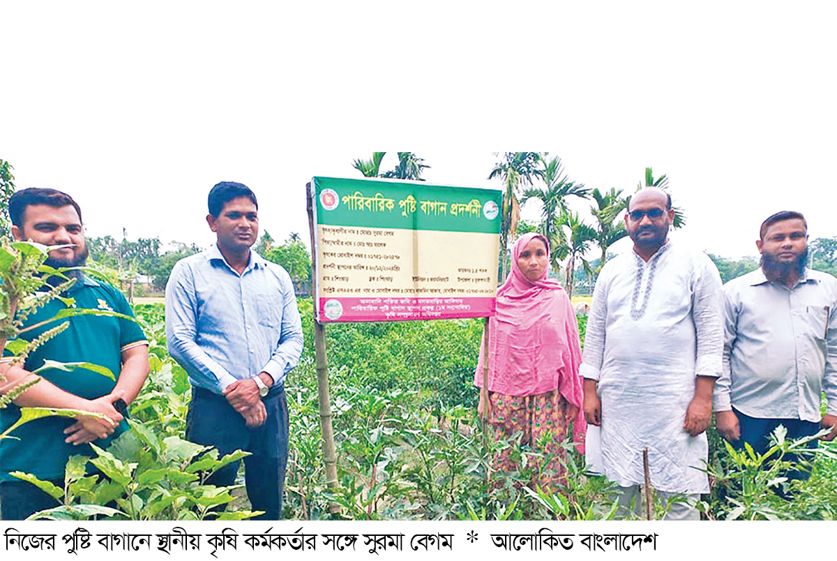 কৃষানি সুরমা বেগম জানান, আমার বসতবাড়ির পাশের জমিটি দীর্ঘদিন থেকে পতিত ছিল, কোনো শাকসবজি বা ফলের গাছ লাগাইনি। স্থানীয় ব্লকের উপসহকারী কৃষি কর্মকর্তা জনাব শহিদুল ইসলামের সু-পরামর্শে আমার বসতবাড়ির আঙ্গিনায় বিভিন্ন শাকসবজি, ঢ্যাঁড়স, বেগুন, মরিচ, লাল শাক, বাঁধাকপি, পালং শাক, মাচায় লাউ ও মিষ্টি কুমড়া আবাদ করে নিজ পরিবারের চাহিদা মিটিয়ে আত্মীয়-স্বজন, পাড়া-প্রতিবেশী ও এলাকার অসহায় হতদরিদ্রদের মাঝে বিতরণ করেও বেশ কিছু টাকার সবজি বিক্রি করে অর্থ জমিয়েছি। এখন আমার প্রতিবেশিদের প্রতি সু-পরামর্শ হলো আমার মতো সবাই যদি বাড়ির বসতবাড়ির আঙ্গিনায় এরকম পুষ্টিবাগান স্থাপন করে তাহলে বাজার থেকে আর শাকসবজি কিনে খেতে হবে না। পতিত জমির এই বাগনই পারিবারিক পুষ্টি যোগান দিবে, এবং নিরাপদ খাদ্য নিশ্চিত করবে এবং উদ্যোগী পরিবার অবশ্যই আমার ন্যায় আর্থিকভাবে স্বাবলম্বী হবে।