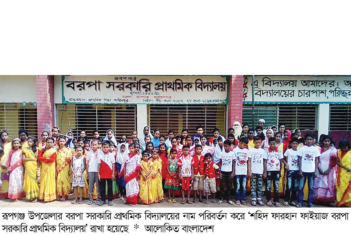 নারায়ণগঞ্জ জেলার রূপগঞ্জ উপজেলার বরপা সরকারি প্রাথমিক বিদ্যালয়ের নাম পরিবর্তন করে ‘শহিদ ফারহান ফাইয়াজ বরপা সরকারি প্রাথমিক বিদ্যালয়’ রাখা হয়েছে। গত মঙ্গলবার প্রাথমিক শিক্ষা ও গণশিক্ষা মন্ত্রণালয়ের যুগ্ম সচিব রেবেকা সুলতানা স্বাক্ষরিত এক প্রজ্ঞাপন থেকে এ তথ্য জানা গেছে। সরকারি প্রাথমিক বিদ্যালয়ের নামকরণ ও বিদ্যমান নাম পরিবর্তন নীতিমালা-২০২৩ অনুযায়ী এই নামকরণ করা হয়েছে।