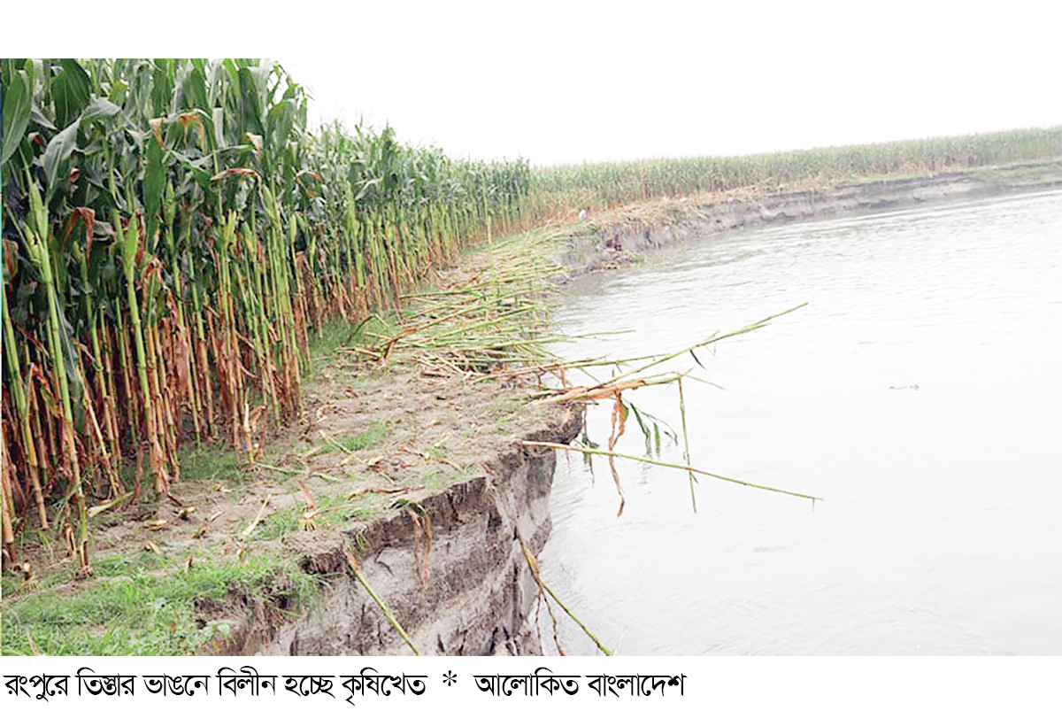 রংপুরে অসময়ে তিস্তার নদীতে ভাঙন শুরু করেছে। এরই মধ্যে গঙ্গাচড়া উপজেলায় ১০টি বসতভিটা নদীগর্ভে বিলীন হয়ে গেছে। পানি বৃদ্ধির ফলে তিস্তাপবষ্টিত কাউনিয়া উপজেলাতে ডুবতে শুরু করেছে চরের বুকে চাষ করা বাদামখেত।
