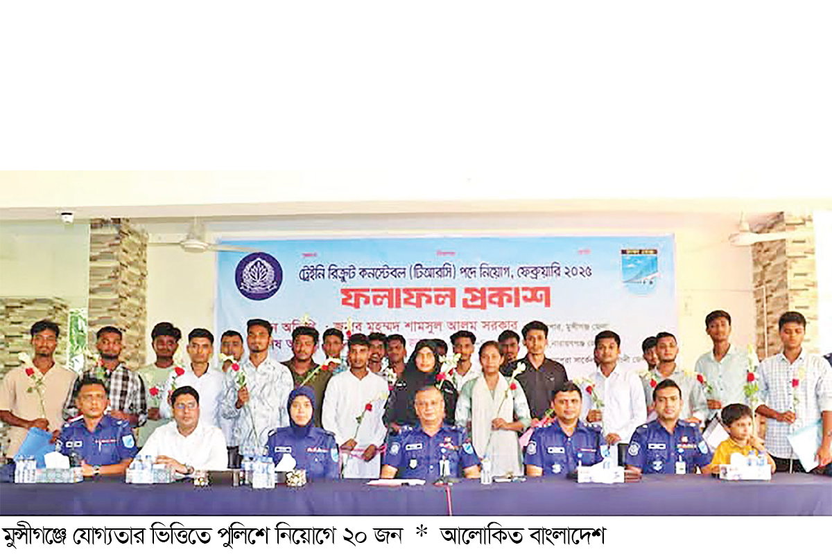 মুন্সীগঞ্জে সম্পূর্ণ মেধা ও যোগ্যতার মাপকাঠিতে মাত্র ১২০ টাকার ব্যাংক ড্রাফটের বিনিময়ে পুলিশে চাকরি পেয়েছেন ২০ জন। এরমধ্যে ১৮ জন পুরুষ ও দুইজন নারী। জেলা পুলিশের আয়োজনে গত বৃহস্পতিবার মুন্সীগঞ্জ জেলার নিয়োগ বোর্ডের সভাপতি পুলিশ সুপার মুহম্মদ শামসুল আলম সরকার পুলিশ লাইন্স ড্রিল শেডে আনুষ্ঠানিকভাবে টিআরসি নিয়োগ কার্যক্রমের সব ইভেন্টে কৃতকার্য প্রার্থীদের লিখিত, মনস্তাত্ত্বিক ও মৌখিক পরীক্ষার প্রাপ্ত নম্বরের ভিত্তিতে মেধাক্রম অনুযায়ী চূড়ান্তভাবে উত্তীর্ণ প্রার্থীদের নাম ঘোষণা করেন এবং জেলা পুলিশের পক্ষ থেকে তাদের ফুলেল অভিনন্দন জানান।