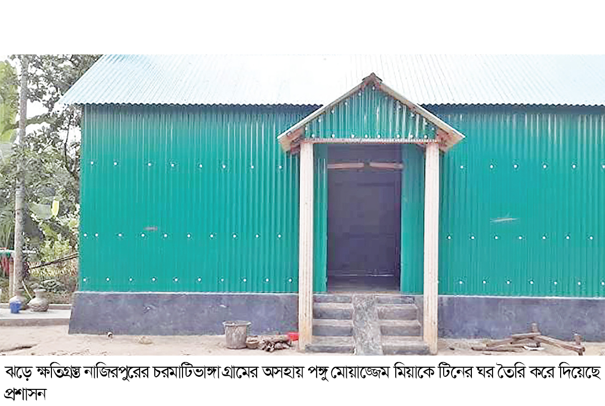 পিরোজপুরের নাজিরপুরের পঙ্গু মোয়াজ্জেম মিয়ার ঘরটা এমনিতেই নড়বড়ে ছিল। ঝড়-তুফানের সময় ভয়ে থাকতেন। এরমধ্যে একদিন হঠাৎ কালবৈশালী ঝড়ে গাছ পড়ে ভেঙে পড়ে ঘরের উপর। ঘরটি ব্যাপক ক্ষতিগ্রস্ত হয়। চোখের সামনে যখন প্রবল অন্ধকার, তখন আলো হয়ে পাশে দাঁড়ায় স্থানীয় প্রশাসন। মাত্র দুই দিনের মধ্যে টিনসেট নতুন ঘর পেয়ে অনেক খুশি তিনি। নাজিরপুর উপজেলা প্রশাসন ও স্থানীয় সূত্রে জানা গেছে, উপজেলার ১নং মাটিভাঙ্গা ইউনিয়নের চরমাটিভাঙ্গা গ্রামের অসহায় পঙ্গু মোয়াজ্জেম মিয়ার ঘরটি গত ২০ মে কালবৈশালী ঝড়ে গাছ ভেঙে পড়ে বসতঘর দুমড়েমুচড়ে যায়। এতে অল্পের জন্য রক্ষা পান বসতঘরের বাসিন্দারা। মাথা গোঁজার ঠাঁই হারিয়ে স্ত্রীকে নিয়ে দিশেহারা হয়ে পড়েন তিনি। মানুষের সাহায্যেই কোনো রকমে সংসার চলে। এর মধ্যে নতুন ঘর কীভাবে বানাবেন, তা নিয়ে দুশ্চিন্তায় পড়েন তিনি। মোয়াজ্জেমের ঘর ভেঙে পড়ার কথা জানতে পারেন নাজিরপুর উপজেলা নির্বাহী অফিসার মো. ফজলে রাব্বি এবং তিনি ঘটনাস্থল পরিদর্শন করেন। এ সময় ঘর হারানো পরিবারটিকে একটি নতুন ঘর তৈরি করে দেওয়ার আশ্বাস দেন। জেলা প্রশাসক আশরাফুল আলম খান এর নির্দেশনায় মাত্র দুই দিনের মাথায় তার নিজ জমিতে একটি টিন সেট ঘর তৈরি করে দেন। গত ২১ মে বুধবার পরিবারের সদস্যদের নিয়ে নতুন ঘরে ওঠেছেন মোয়াজ্জেম। মোয়াজ্জেম বলেন, নতুন ঘর পাওয়ার কথা তিনি ভাবতেও পারছিলেন না। এখন নতুন ঘর পেয়ে মনে অনেক শান্তি পাচ্ছেন। আগে ঝড়-বৃষ্টির সময় ভয়ে ঘুমুতে পারতেন না। এখন আর সেই ভয়ও থাকবে না। নাজিরপুর উপজেলা নির্বাহী অফিসার ইউএনও মো. ফজলে রাব্বি বলেন, জেলা প্রশাসক স্যারের নির্দেশে আমি ঘটনাস্থল পরিদর্শন করি। কালবৈশাখী ঝড়ে তাদের ঘর ভেঙেচুরে যায়।