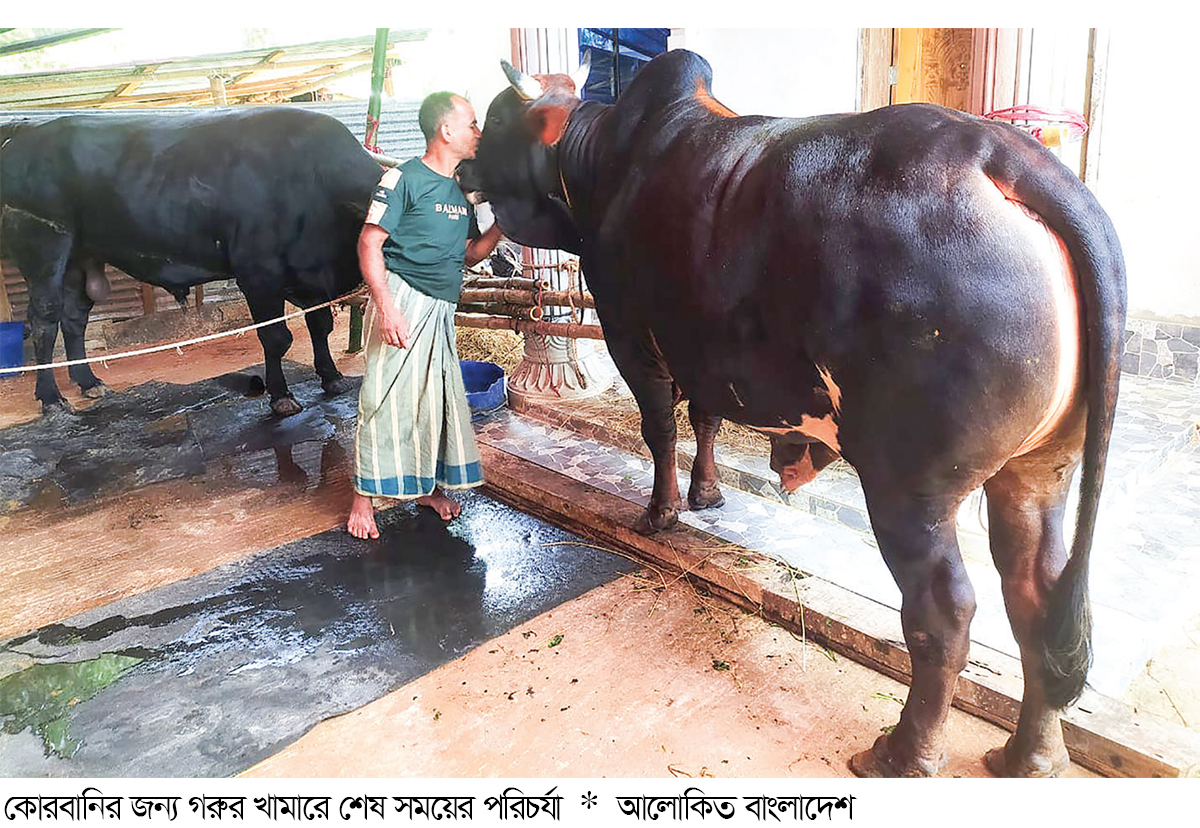 গরমের সময় চারবারও গোসল করাতে হয়। খাবারের মধ্যে ছোলা, ভূসি, কুঁড়ো ও কাঁচা-শুকনো ঘাস রয়েছে। স্থানীয় নানুপুরের বাসিন্দা মো. জহুর, বাবলা, মো. হাসান জানান, মালিক খুব যত্ন করে গরু দু’টিকে। এর আগে এই গ্রামে কখনও এমন বড় গরু দেখিনি। উপজেলা বড় পশু বাজার ভারত সীমান্ত এলাকা বাগান বাজার ইজারাদার মো. কাসেম বলেন- এখানে পূর্বের চেয়েও প্রতি হাটে বেশি পশু উঠেছে। ছোট বড় প্রতি পশু থেকে ৬০০ টাকা হাছিল নেওয়া হচ্ছে বলে তিনি জানান।