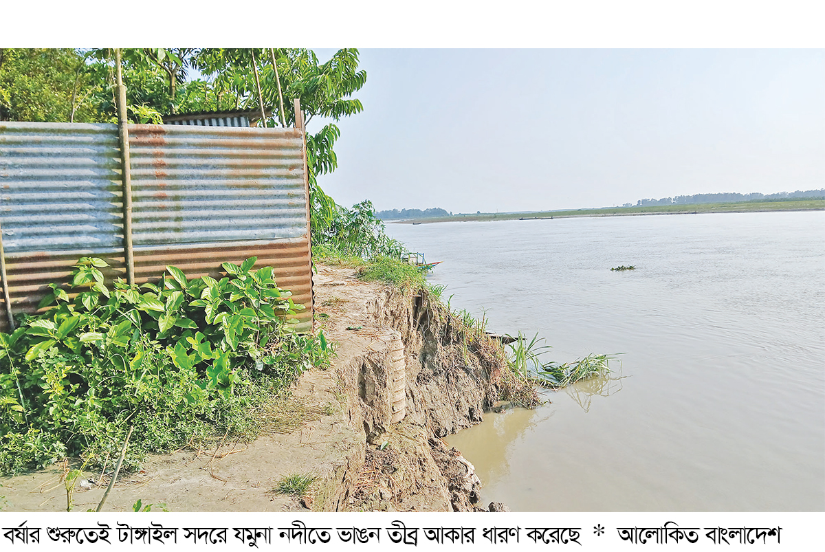 বর্ষার শুরুতেই টাঙ্গাইল সদর উপজেলায় যমুনা নদীতে তীব্র ভাঙনের কবলে পড়েছে বেশ কয়েকটি শিক্ষা প্রতিষ্ঠানসহ ৫ শতাধিক পরিবার। শঙ্কায় দিন কাটছে এসব পরিবারে। শিক্ষা প্রতিষ্ঠানের মধ্যে রয়েছে দক্ষিণ গয়লা হোসেন দাখিল মাদ্রসা, ডেকিয়া বাড়ি সরকারি প্রাথমিক বিদ্যালয়, দক্ষিণ গয়লা হোসেন নুরানি মাদ্রাসা, দক্ষিণ গয়লা হোসেন জামে মসজিদ, দক্ষিণ গোলাশন কবরস্থান এবং আব্দুল মান্নান সেতু।