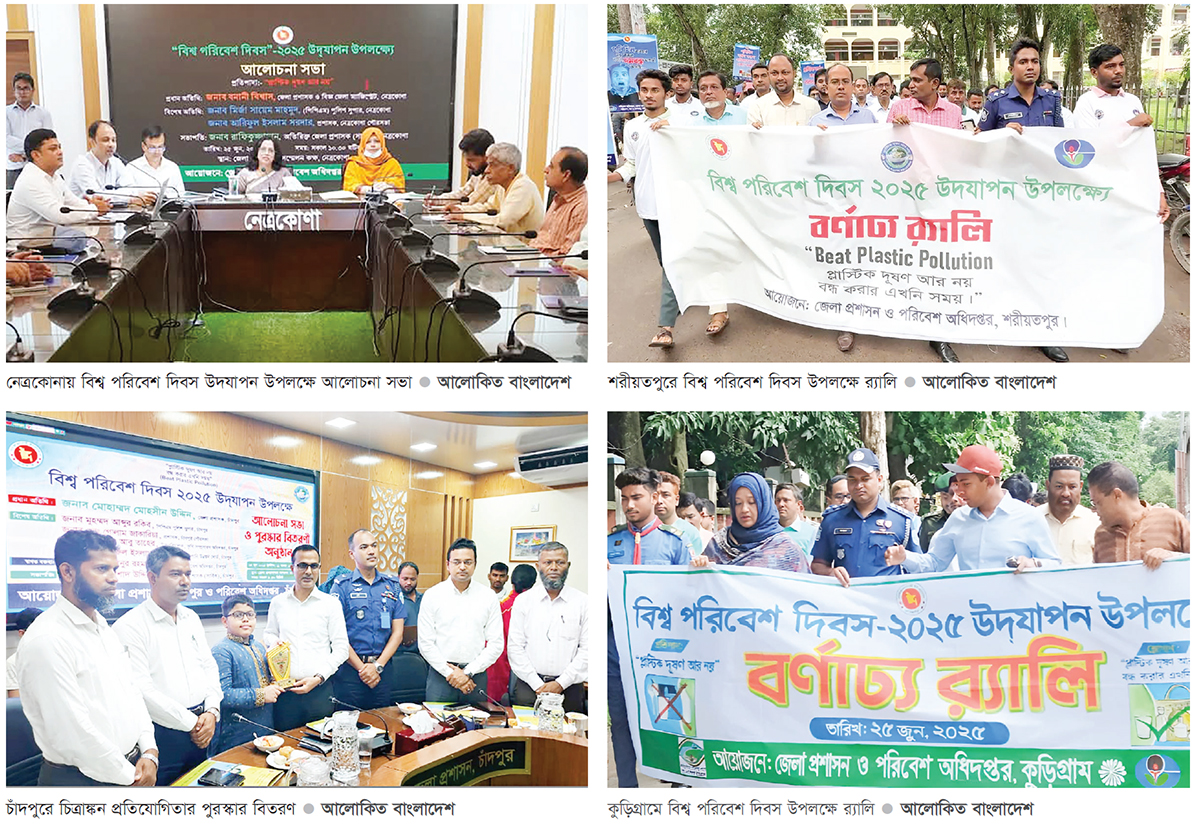 শেরপুর : গতকাল সকালে জেলা কালেক্টরেট চত্বর থেকে জেলা প্রশাসক তরফদার মাহমুদুর রহমানের নেতৃত্বে একটি বর্ণাঢ্য র্যালি শহরের গুরুত্বপূর্ণ সড়ক প্রদক্ষিণ করে। পরে জেলা প্রশাসকের সম্মেলন কক্ষে আয়োজিত আলোচনা সভায় প্রধান অতিথি হিসেবে বক্তব্য রাখেন জেলা প্রশাসক তরফদার মাহমুদুর রহমান। অতিরিক্ত জেলা প্রশাসক মোসা. হাফিজা জেসমিনের সভাপতিত্বে সভায় আরও বক্তব্য রাখেন সিভিল সার্জন ডা. মো. শাহীন, জেলা পরিবেশ অধিদপ্তরের সহকারী পরিচালক মো. নুর কুতুবে আলম সিদ্দিক, বিএনপি নেতা আব্দুল আওয়াল চৌধুরী, জামায়াত নেতা মাওলানা জাকারিয়া মো. আব্দুল বাতেন, বীর মুক্তিযোদ্ধা আব্দুর রহিম দুলাল, এনসিপি নেতা রাশেদুল ইসলাম, জেলা বৈষম্যবিরোধী ছাত্র আন্দোলনের আহ্বায়ক মামুনুর রহমান প্রমুখ। বক্তারা তাদের বক্তব্যে প্লাস্টিক দূষণরোধে সচেতনতা বৃদ্ধি এবং প্লাস্টিকের বিকল্প ব্যবহারে উৎসাহিত করার ওপর জোর দেন।