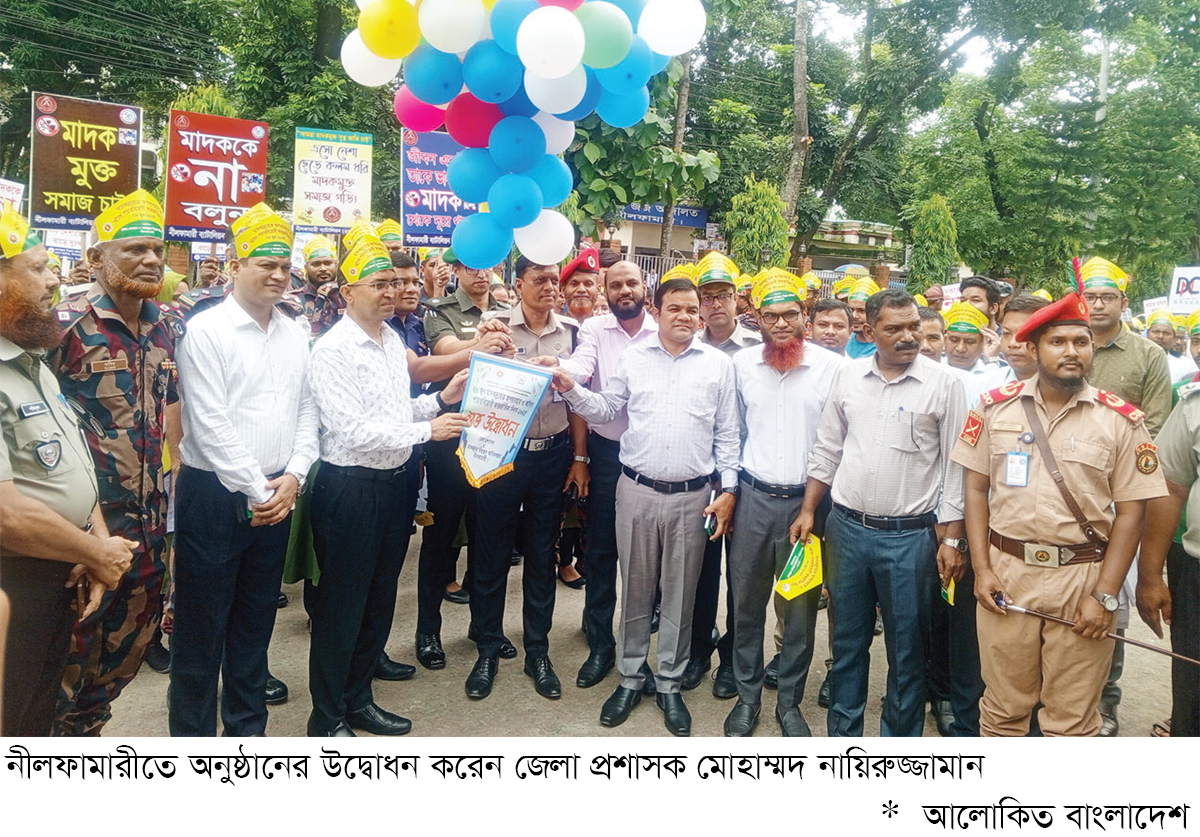 নীলফামারী : জেলা প্রশাসন ও মাদকদ্রব্য নিয়ন্ত্রণ অধিদপ্তরের যৌথ আয়োজনে অনুষ্ঠিত হয় এবারের কর্মসূচি ‘উৎসব বন্ধন’। গতকাল সকাল ১০টায় জেলা প্রশাসকের কার্যালয় প্রাঙ্গনে সংগীত পরিবেশনের মধ্য দিয়ে অনুষ্ঠানের সূচনা পর্ব শুরু হয়, জেলা প্রশাসক মোহাম্মদ নায়িরুজ্জামান বেলুন ওড়িয়ে অনুষ্ঠানের আনুষ্ঠানিকতা উদ্বোধন করেন এবং একটি বর্ণাঢ্য র‌্যালি জেলা প্রশাসকের কার্যালয় থেকে শুরু করে শহরের প্রধান প্রধান সড়ক প্রদক্ষিণ করে। র‍্যালিতে অংশ নেন মাদকদ্রব্য নিয়ন্ত্রণ অধিদপ্তরের জেলা কার্যালয়ের কর্মকর্তা, জেলা পুলিশ প্রশাসন, ফায়ার সার্ভিস, শহরের স্কুল কলেজের শিক্ষক-শিক্ষার্থী, পেশাজীবী সংগঠন ও সাংবাদিক প্রতিনিধিরা। র‌্যালি শেষে জেলা প্রশাসক মোহাম্মদ নায়িরুজ্জামান বলেন, মাদকের প্রতিরোধের প্রথম ধাপ হলো পরিবার থেকে শুরু করা উচিত, আর তরুণ প্রজন্মকে রক্ষা করতে হলে শিক্ষাপ্রতিষ্ঠান, প্রশাসন, পরিবার ও মিডিয়ার সম্মিলিত উদ্যোগের প্রয়োজন বা দরকার। তিনি আরও বলেন, এই ধরনের সচেতনতামূলক কর্মসূচি প্রতিনিয়ত আমাদের দায়িত্ব ও কর্তব্য হিসেবে গ্রহণ করতে হবে। দেশে মাদকের বিস্তার ও থাবা থেকে রক্ষা পেতে হলে সীমান্তবর্তী অঞ্চলগুলোকে নজরদারি বাড়াতে হবে আর শিক্ষাপ্রতিষ্ঠান ও শহর নগরে সচেতনতা বৃদ্ধি করতে হবে। তারই পরিপ্রেক্ষিতে নীলফামারীর মতো জেলায় মাদকবিরোধী এমন সচেতনতামূলক আয়োজন একটি শক্তিশালী বার্তা পৌঁছে দিবে দেশের আনাচেকানাচে।