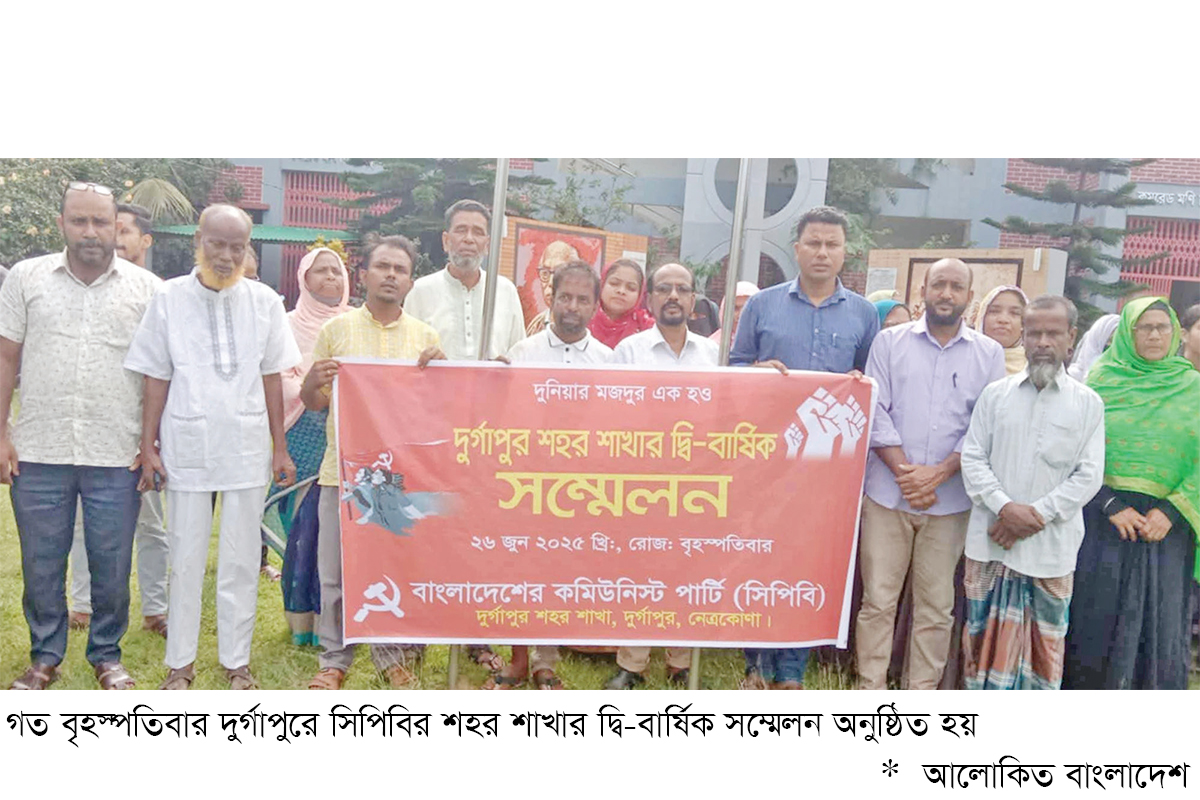 নেত্রকোনার দুর্গাপুরে বাংলাদেশের কমিউনিস্ট পার্টি (সিপিবি) দুর্গাপুর শহর শাখার দ্বি-বার্ষিক সম্মেলন উৎসবমুখর পরিবেশে অনুষ্ঠিত হয়েছে। গত বৃহস্পতিবার কমরেড মণি সিংহ স্মৃতি জাদুঘর প্রাঙ্গণে জাতীয় ও দলীয় পতাকা উত্তোলন, জাতীয় সংগীত এবং দলের আন্তর্জাতিক সংগীত পরিবেশনের মধ্য দিয়ে সম্মেলনের সূচনা হয়। সম্মেলনের আনুষ্ঠানিক উদ্বোধন করেন