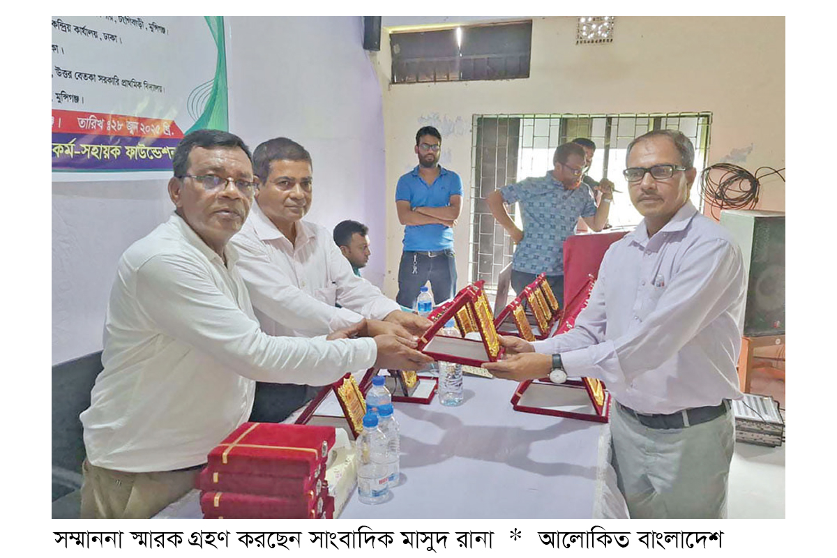 মুন্সীগঞ্জের টংগীবাড়িতে রিসোর্স ইন্টিগ্রেশন সেন্টার (রিক) এর আয়োজনে পল্লী কর্ম সহায়ক ফাউন্ডেশনের সহযোগিতায় সমৃদ্ধি উন্নয়ন মেলা অনুষ্ঠিত হয়েছে। মেলা শেষে রিসোর্স ইন্টিগ্রেশন সেন্টার (রিক) এর আয়োজনে গত শনিবার সোনারং সরকারি পাইলট মডেল উচ্চ বিদ্যালয়ে হল রুমে বিভিন্ন ক্যাটাগরিতে রিকের পক্ষ থেকে সম্মাননা স্মারক প্রদান করা হয়। এ সময় রিকের সমৃদ্ধি কর্মসূচির সংবাদ প্রতিবেদন প্রকাশে বিশেষ অবদান রাখায় রিকের সংস্থার পক্ষ থেকে দৈনিক আলোকিত বাংলাদেশের মুন্সীগঞ্জ জেলা প্রতিনিধি ও মুন্সীগঞ্জ প্রেসক্লাবের দপ্তর সম্পাদক মাসুদ রানাকে সম্মাননা স্মারকটি প্রদান করেন প্রধান অতিথি মুন্সীগঞ্জ যুব উন্নয়নের সহকারী পরিচালক নজরুল ইসলাম। রিক মুন্সীগঞ্জের সহকারী ম্যানেজার মোয়াজ্জেম হোসেনের সভাপতিত্বে বিশেষ অতিথি হিসাবে উপস্থিত ছিলেন সোনারং সরকারি পাইলট মডেল উচ্চ বিদ্যালয়ের প্রধান শিক্ষক রফিকুল ইসলাম, রিকের মুন্সীগঞ্জ জোনাল ম্যানেজার মো. তৌহিদুজ্জামান, উত্তর বেতকা সরকারি প্রাথমিক বিদ্যালয়ের প্রধান শিক্ষক খোরশেদ আলম শেখ, রিক বালিগাঁও শাখার ম্যানেজার মো. কামরুজ্জামান, উপজেলা সমৃদ্ধি কর্মসূচির সমন্বয়কারী সৈয়দ ওয়াহিজুর রহমানের সঞ্চলনায় স্থানীয় জনপ্রতিনিধিরা উপস্থিত ছিলেন।