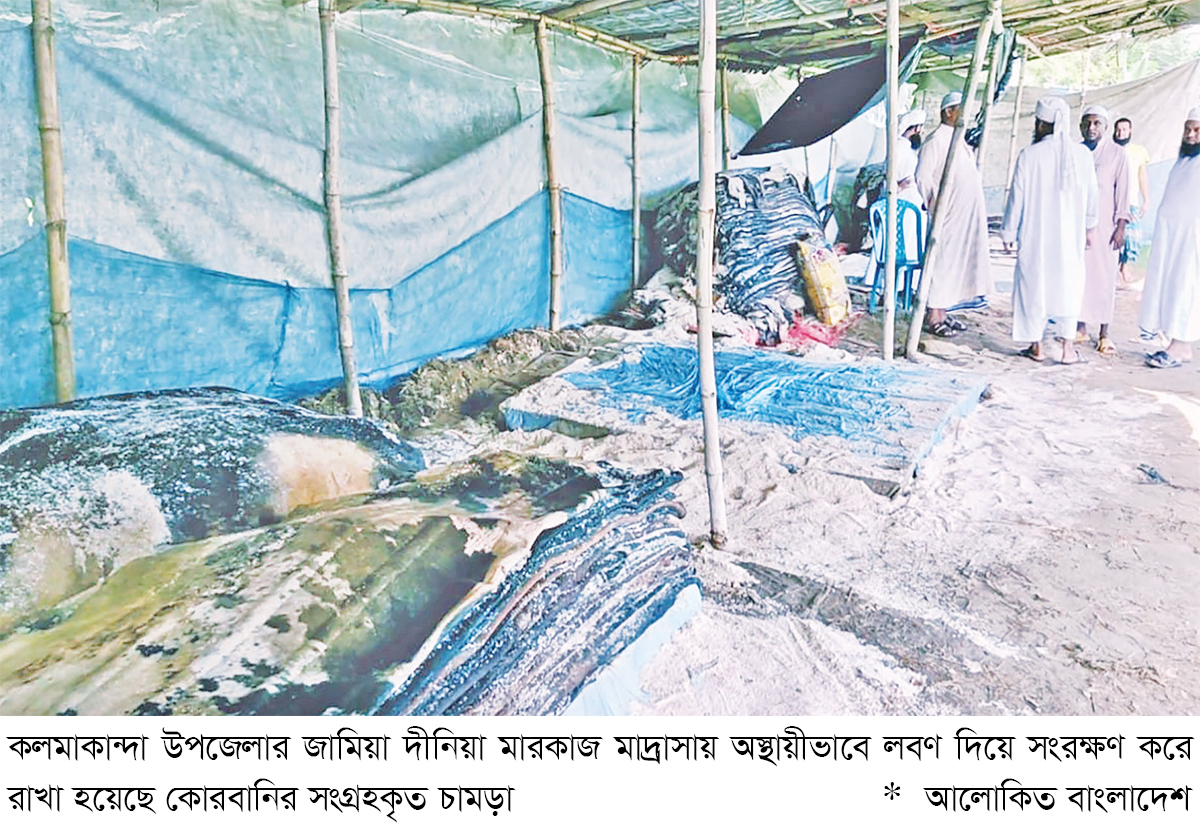 ঢাকার ট্যানারি কারখানাগুলোর আগ্রহের অভাবে কোরবানির চামড়া বিপণনে মারাত্মক সংকট দেখা দিয়েছে। নেত্রকোনার কলমাকান্দাসহ দেশের বিভিন্ন উপজেলায় মাদ্রাসা ও এতিমখানাগুলোতে শত শত পশুর চামড়া অবিক্রিত পড়ে রয়েছে। কলমাকান্দা উপজেলার জামিয়া দীনিয়া মারকাজ মাদ্রাসা এবারে কোরবানির ৬০০ চামড়া সংগ্রহ করেছে। কিন্তু এখন পর্যন্ত ঢাকার কোনো ট্যানারি কিনতে আগ্রহ দেখায়নি। চামড়াগুলো লবণ দিয়ে অস্থায়ীভাবে সংরক্ষণ করা হয়েছে। মাদ্রাসা কর্তৃপক্ষ জানায়, প্রতি বছর এই চামড়ার বিক্রয়লব্ধ অর্থে শিক্ষার্থীদের খরচ, হোস্টেল মেরামতসহ নানাবিধ ব্যয় মেটানো হয়। এবার তা অনিশ্চয়তায় পড়েছে। মাদ্রাসার মোহতামিম মুফতি শফিকুর রহমান বলেন, আমরা চামড়াগুলো বিক্রি করে মাদ্রাসার খরচ চালিয়ে থাকি। কিন্তু এবার বিক্রি করতে না পারায় চরম দুশ্চিন্তায় আছি।