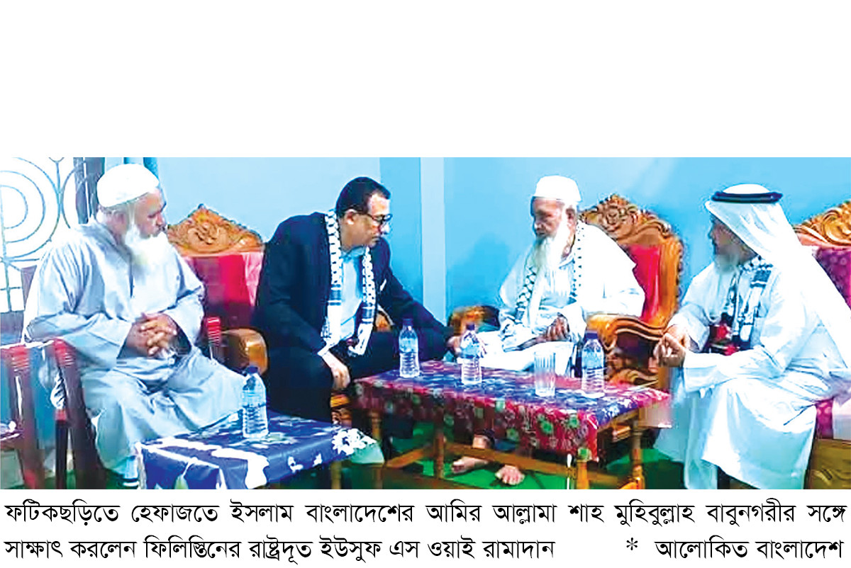 হেফাজতে ইসলাম বাংলাদেশের আমির আল্লামা শাহ মহিবুল্লাহ বাবুনগরীর সঙ্গে সাক্ষাৎ করতে চট্টগ্রামের ফটিকছড়ির বাবুনগর (কওমী) মাদ্রাসায় এলেন ফিলিস্তিনের রাষ্ট্রদূত ইউসুফ ইউসুফ এস ওয়াই রামাদান। গতকাল সোমবার সকাল সাড়ে ১০টায় তিনি আকস্মিক এই সফরে আসেন। রাষ্ট্রদূত মাদ্রাসায় এসে পৌঁছলে দায়িত্বশীল শিক্ষক ও হেফাজতে ইসলামের স্থানীয় নেতৃবৃন্দ তাকে ফুলেল শুভেচ্ছা জানান। পরে রাষ্ট্রদূত হেফাজত আমিরের তার অফিস কক্ষে পূর্ব নির্ধারিত বৈঠকে মিলিত হন। এ সময় রাষ্ট্রদূতের সফর সঙ্গী হাইকমিশনের ঊর্ধ্বতন তিন কর্মকর্তা ছাড়াও হেফাজতে ইসলামের সিনিয়র নেতৃবৃন্দরা উপস্থিত ছিলেন। জানতে চাইলে বিষয়টি স্বীকার করে হেফাজতে ইসলামের ফটিকছড়ি উপজেলা শাখার আমির ও মাদ্রাসার সহকারী পরিচালক মাওলানা আইয়ুব বাবুনগরী বলেন- মাদ্রাসায় এটি ফিলিস্তিন রাষ্ট্রদূতের আকস্মিক সফর। মূলত ইসরায়েলের সঙ্গে চলমান যুদ্ধে ফিলিস্তিনের পাশে থাকার জন্য ধন্যবাদ জানাতে তিনি হেফাজত আমিরের সঙ্গে সৌজন্য সাক্ষাৎ করতে ছুটে এসেছেন। এর বাইরে ইসলাম ও দেশের নানাবিষয় নিয়ে দুইজন একান্তে কথা বলেন।