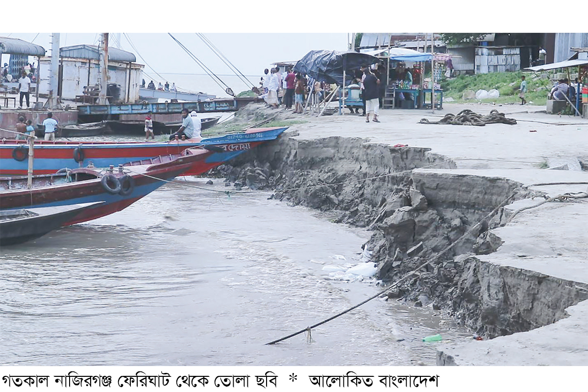 গতকাল সরেজমিন দেখা যায়, নাজিরগঞ্জ ফেরিঘাটের পূর্ব পাশের ফেরি পল্টনের নীচ থেকে বড় বড় পার ভেঙে নদীতে পড়ছে।