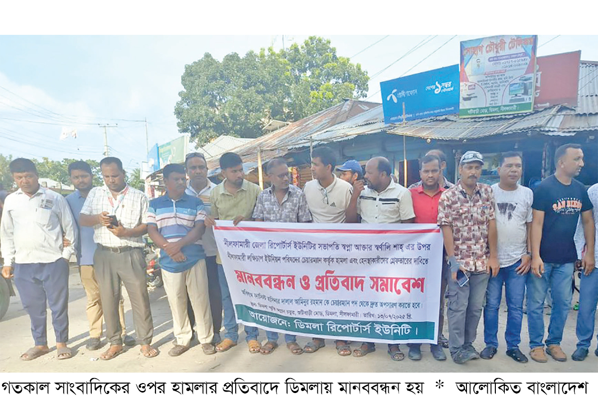 নীলফামারীর ডিমলা উপজেলা রিপোর্টার্স ইউনিটির আয়োজনে শহরের থানার মোড়ে ডিমলা রিপোর্টার্স ইউনিটির সভাপতি মহিবুল ইসলামের সভাপতিত্বে ও সাধারণ সম্পাদক আসাদুজ্জামান পাভেলে সঞ্চালনায় এই মানববন্ধনে বক্তব্য রাখেন সাবেক সভাপতি বাদশা সেকেন্দার ভুট্টু। স্বাগত বক্তব্যে জেলা রিপোর্টার্স ইউনিটির সদস্য ও দীপ্তমান বাংলাদেশের সম্পাদক আব্দুল মমিন বলেন, নীলফামারী জেলা রিপোর্টার্স ইউনিটির সভাপতি স্বপ্না আকতার স্বর্ণালি শাহ ও কয়েকজন সংবাদকর্মী সংবাদ সংগ্রহ করতে লক্ষিচাপ ইউনিয়নের ২নং ওয়ার্ডের জঙলী পাড়া গ্রামে গেলে ঐ এলাকার চেয়ারম্যান ফ্যাসিস্ট আওয়ামী লীগের দোসর আমিনুর রহমান ও তার লোকজন সাংবাদিকদের ঘিরে ধরে টানা হ্যাচরা ও গ্লোবাল টিভির জেলা প্রতিনিধি সোহেল রানার হাতে থাকা ডিজিটাল ক্যামেরা ছিনিয়ে নেন এবং সাংবাদিক স্বপ্না আকতার স্বর্ণালি শাহকে উদ্দেশ্য করে চেয়ারম্যান অকথ্য ভাষায় গালিগালাজ করেন এবং মেরে ফেলার হুমকি দেন।
