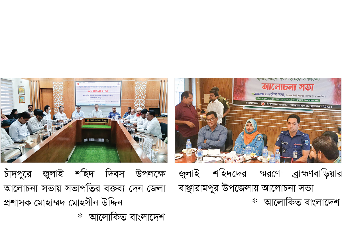 বাঞ্ছারামপুর (ব্রাহ্মণবাড়িয়া) : জুলাই গণঅভ্যুত্থানে শহিদদের স্মরণে ব্রাহ্মণবাড়িয়ার বাঞ্ছারামপুর উপজেলায় আলোচনা সভা অনুষ্ঠিত হয়েছে। গতকাল জুলাই শহিদ দিবস উপলক্ষে উপজেলা প্রশাসনের হলরুমে এ আয়োজন করা হয়। এ সময় বক্তব্য দিতে গিয়ে বাঞ্ছারামপুর উপজেলা প্রেসক্লাবের নেতৃবর্গ বলেন, উপজেলার ৮/৯ জন সংবাদকর্মী একটি অশুভ মামলাবাজদের খপ্পরে পড়েছে। ফ্যাসিস্ট আওয়ামী লীগের বিরুদ্ধে যারা লিখে বা যে রাজনৈতিক নেতাকর্মীদের নামে জুলাই শহিদদের নিয়ে ঢাকাসহ দেশের বিভিন্ন স্থানে মিথ্যা মামলা দিয়ে হয়রানি করা হচ্ছে।