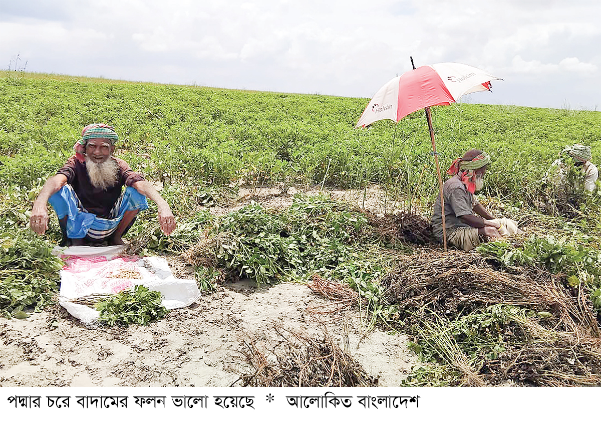 অনুকূল আবহাওয়া এবং উপযুক্ত মাটি থাকায় ঈশ্বরদীর পদ্মা নদীর জেগে ওঠা চরাঞ্চলে বাদাম চাষের জন্য সহায়ক হওয়ায় এবার বাদামের বাম্পার ফলন হয়েছে। চাষিরা বাজারে বাদামের ভালো দাম পাওয়ায় আর্থিকভাবে লাভবান হচ্ছেন। এতে বাদাম চাষিদের মুখে হাসি ফুঠলেও বাগড়া দিচ্ছে বৃষ্টি। মাসব্যাপী চলমান বৃষ্টিতে চর থেকে উঠানো বাদাম শুকাতে হিমশিম খাচ্ছেন। প্রতিদিনই হচ্ছে বৃষ্টি। দিনের কোনো সময় রোদ উঠলে চাষিরা প্রতিবেশীর ছাদে বাদাম শুকাচ্ছেন, কেউবা ফাঁকা ঘরের মেঝেতে ফ্যানের বাতাসে বাদাম শুকানোর চেষ্টা করছেন।