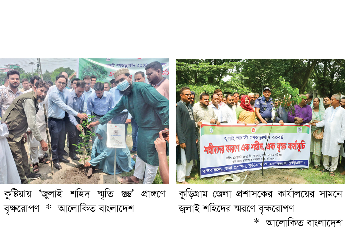 কুড়িগ্রাম : জেলা প্রশাসকের কার্যালয়ের সামনে জুলাই শহিদের স্মরণে বৃক্ষ রোপণ করে এ কর্মসূচি বাস্তবায়িত হয়। সেই সঙ্গে জেলা শহরস্থ কলেজ মোড়ের পার্শ্ববর্তী স্থানে ‘জুলাই শহিদ স্মৃতি স্তম্ভ’ স্থাপন করা হয়। বৃক্ষরোপণ কর্মসূচি ও জুলাই স্তম্ভের সূচনা করেন জেলা প্রশাসক নুসরাত সুলতানা। অনুষ্টানে অন্যান্যের মধ্যে অংশ নেন- জেলা পুলিশ সুপার মাহফুজুর রহমান, জেলা বিএনপির আহ্বায়ক মোস্তাফিজুর রহমান, সদস্য সচিব সোহেল হোসনাইন কায়কোবাদ, ১নং যুগ্ম আহ্বায়ক অধ্যাপক শফিকুল ইসলাম বেবু, যুগ্ম আহ্বায়ক অধ্যাপক হাসিবুর রহমান হাসিব, বৈষম্য বিরোধী ছাত্র আন্দোলনের জেলা সমন্বয় নাহিদ ইসলাম প্রমুখ।
