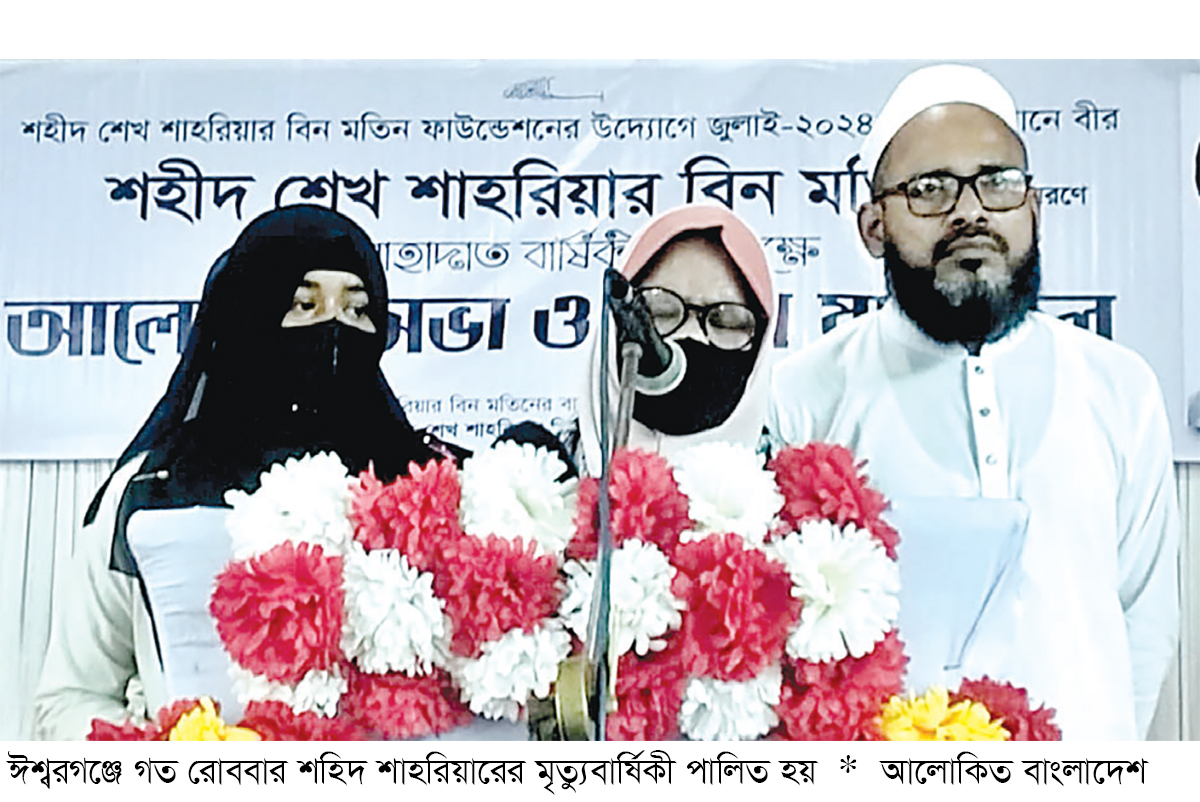 গত রোববার স্থানীয় জেলা পরিষদ অডিটোরিয়ামে শেখ শাহরিয়ার বিন মতিন ফাউন্ডেশনের চেয়ারম্যান শহিদের পিতা আব্দুল মতিনের সভাপতিত্বে আলোচনাসভা ও দোয়া অনুষ্ঠিত হয়। ঈশ্বরগঞ্জ আইডিয়াল কলেজের প্রভাষক মো. মাসুম বিল্লাহর সঞ্চালনায় সভায় বক্তব্য রাখেন, শেখ শাহরিয়ার বিন মতিনের মা মমতাজ বেগম, সাবেক এমপি আলহাজ্ব শাহ নূরুল কবীর শাহীন, উপজেলা বিএনপির আহ্বায়ক লুৎফুল্লাহেল মাজেদ বাবু, সদস্য-সচিব আমিরুল ইসলাম ভূঁইয়া মনি, এলডিপির প্রেসিডিয়াম সদস্য আওরঙ্গজেব বেলাল, উপজেলা জামায়াতের সাধারণ সম্পাদক আবুল খায়ের মুহম্মদ বরকত উল্লাহ, ইসলামী আন্দোলন বাংলাদেশের সভাপতি মুফতি মো. হাবিবুল্লাহ, এনসিপি ঈশ্বরগঞ্জ উপজেলার প্রধান সমন্বয়কারী মোজাম্মেল হক ছাত্র প্রতিনিধি হাসানুর রহমান সজিব প্রমুখ।