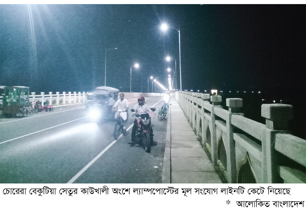 পিরোজপুর-কাউখালীর সীমানা নির্ধারণকারী কঁচা নদীর ওপর নির্মিত ৮ম বাংলাদেশ-চীন মৈত্রী বেকুটিয়া সেতুটি নির্মাণের ৪ বছর পার হতে না হতেই ইলেকট্রিক্যাল বাতি জ্বলছে না। সন্ধ্যা হলেই এক কিলোমিটার এলাকা কালো অন্ধকারে নিমজ্জিত হয়ে যায়। কারণ ১৮ জুলাই রাতের আঁধারে চোরেরা ব্রিজের ল্যাম্পপোস্টের মূল সংযোগ লাইনটি কাউখালী অংশে মাটির নিচ থেকে চুরি করে কেটে নিয়ে যায়। এরপর থেকেই ব্রিজের অর্ধেক অংশে বৈদ্যুতিক আলো থাকলেও কাউখালীর অংশ ঝুঁকিতে পড়েছে। বর্তমানে রাতের বেলায় এই ব্রিজের উপর দিয়ে চলাচল করা গাড়ির চালক ও যাত্রীরা চরম ঝুঁকিনিয়ে সেতুর ১ কিলোমিটার পার হতে হয়।