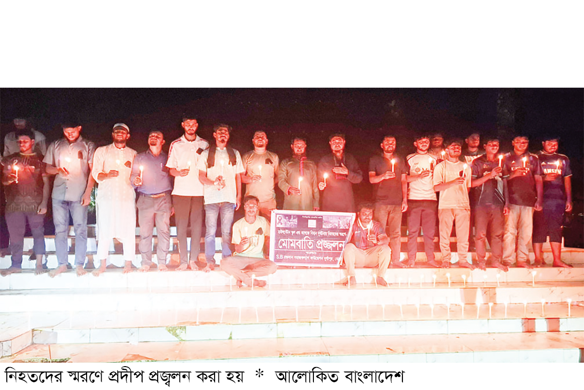 ঢাকার উত্তরার মাইলস্টোন স্কুল অ্যান্ড কলেজ এলাকায় যুদ্ধবিমান বিধ্বস্ত হয়ে শিক্ষার্থীসহ নিহতদের স্মরণে নেত্রকোনার দুর্গাপুরে মোমবাতি প্রজ্বলন কর্মসূচি পালন করেছে স্বেচ্ছাসেবী সংগঠন এসবি রক্তদান সমাজ কল্যাণ ফাউন্ডেশন। গত মঙ্গলবার রাতে পৌর শহরের কেন্দ্রীয় শহিদ মিনারে এ কর্মসূচি অনুষ্ঠিত হয়। এসময় প্রজ্বলিত মোমবাতি হাতে নিয়ে নিহতদের স্মরণে এক মিনিট নীরবতা পালন করেন উপস্থিতি সবাই। সেই সঙ্গে তাদের আত্মার মাগফিরাত কামনা এবং আহতদের দ্রুত সুস্থতা কামনা করেন অংশগ্রহণকারীরা। কর্মসূচিতে উপস্থিত ছিলেন- উপজেলা সমাজসেবা কর্মকর্তা মাসুল তালুকদার, প্রেসক্লাবের সাধারণ সম্পাদক মাসুম বিল্লাহ, এসবি রক্তদান সমাজ কল্যাণ ফাউন্ডেশনের সভাপতি সৈকত সরকার, কবি মাহমুদুল হাসান শাওন, সাংবাদিক ওয়ালী হাসান কলি, বৈষম্যবিরোধী ছাত্র আন্দোলন নেত্রকোনা জেলা শাখার যুগ্ম আহ্বায়ক রাতুল খান রুদ্র সহ সংগঠনের সদস্যরা। অংশগ্রহণকারীরা বলেন, উত্তরায় প্রশিক্ষণ বিমান বিধ্বস্ত ও মাইলস্টোন স্কুল-কলেজে ঘটে যাওয়া ভয়াবহ এই দুর্ঘটনা আমাদের সবাইকে গভীরভাবে নাড়া দিয়েছে। সন্তানহারা মা-বাবার কান্না সারা দেশের মানুষকে শোকার্ত করে তুলেছে। আমরা অবিলম্বে ঘটনার সুষ্ঠু তদন্ত, নিহতদের যথাযথ ক্ষতিপূরণ এবং আহতদের সুচিকিৎসা নিশ্চিত করার দাবি জানাচ্ছি। ভবিষ্যতে যাতে আর কোনো বিদ্যালয়ের ওপর এমন দুর্ঘটনা না ঘটে, তার জন্য সরকারকে যথাযথ ব্যবস্থা গ্রহণের আহ্বান জানান তারা।