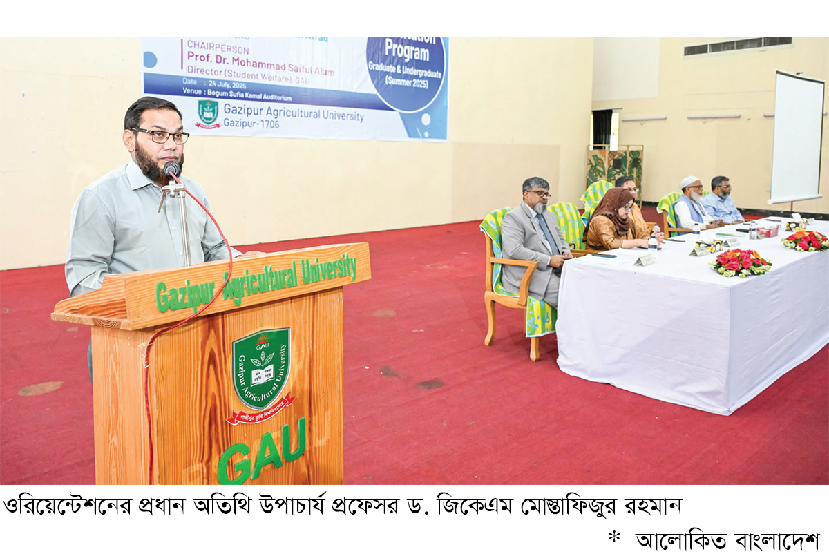 গাজীপুর কৃষি বিশ্ববিদ্যালয়ে (গাকৃবি) সামার-২০২৫ টার্মে ভর্তিকৃত আন্ডার গ্র্যাজুয়েট ও পোস্ট গ্র্যাজুয়েট কোর্সের নতুন শিক্ষার্থীদের ওরিয়েন্টেশন ক্লাস অনুষ্ঠিত হয়েছে। গতকাল বৃহস্পতিবার বেলা ১১টায় বিশ্ববিদ্যালয়ের বেগম সুফিয়া কামাল অডিটোরিয়ামে ওই ওরিয়েন্টেশন অনুষ্ঠিত হয়েছে। অনুষ্ঠানে সভাপতিত্ব করেন, পরিচালক (ছাত্রকল্যাণ) প্রফেসর ড. মোহাম্মদ সাইফুল আলম। গাকৃবির উপাচার্য প্রফেসর ড. জিকেএম মোস্তাফিজুর রহমান ওরিয়েন্টেশন অনুষ্ঠানে উপস্থিত থেকে প্রধান অতিথির আসনকে অলংকৃত করেন। বিশেষ অতিথি হিসেবে গাকৃবির উপর উপাচার্য প্রফেসর ড. এম ময়নুল হক এবং ট্রেজারার প্রফেসর ড. মো. সফিউল ইসলাম আফ্রাদ উপস্থিত ছিলেন। অনুষ্ঠানে উপস্থিত ছিলেন বিভিন্ন অনুষদীয় ডিন, পরিচালক, শিক্ষক, প্রভোস্ট, কর্মকর্তা-কর্মচারী এবং বিএসএর ৪৩৫ জন, এমএসএর ৪৮ এবং পিএইচডি’র ৪ জনসহ মোট ৪৮৭ জন নতুন শিক্ষার্থী ও তাদের অভিভাবক। অনুষ্ঠানের সূচনালগ্নে জুলাই শহিদদের আত্মার মাগফেরাত কামনার্থে বিশেষ দোয়া অনুষ্ঠিত হয়। এরপর প্রদর্শিত হয় বিশ্ববিদ্যালয়ের গৌরবময় অর্জন ও চলমান গবেষণাভিত্তিক কার্যক্রম নিয়ে একটি হৃদয়গ্রাহী তথ্যচিত্র। এতে উঠে আসে কৃষি, প্রযুক্তি ও টেকসই উন্নয়নের পথে বিশ্ববিদ্যালয়ের দীপ্ত পদচারণার চিত্র।