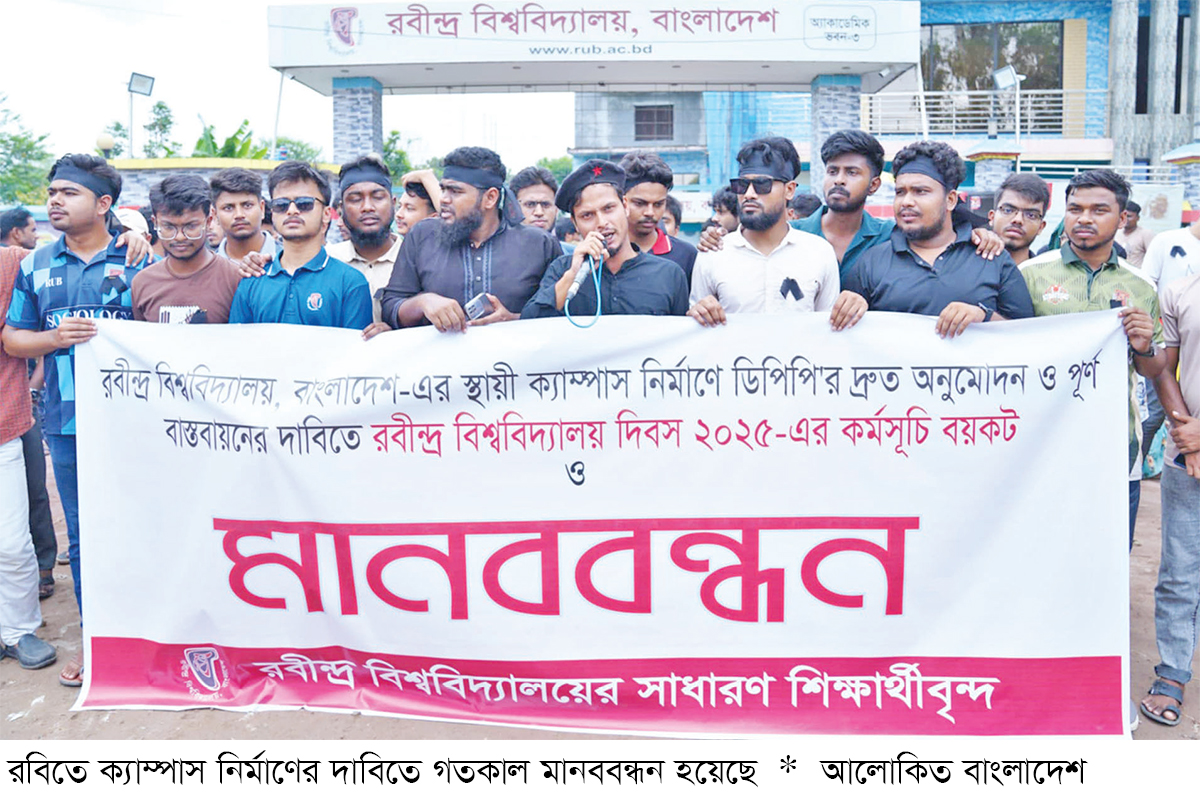 রবীন্দ্র বিশ্ববিদ্যালয়ের স্থায়ী ক্যাম্পাস নির্মাণে ডিপিপির দ্রুত অনুমোদন ও পূর্ণ বাস্তবায়নের দাবিতে রবীন্দ্র বিশ্ববিদ্যালয় দিবস কর্মসূচি বয়কট করে মানববন্ধন করা হয়েছে।