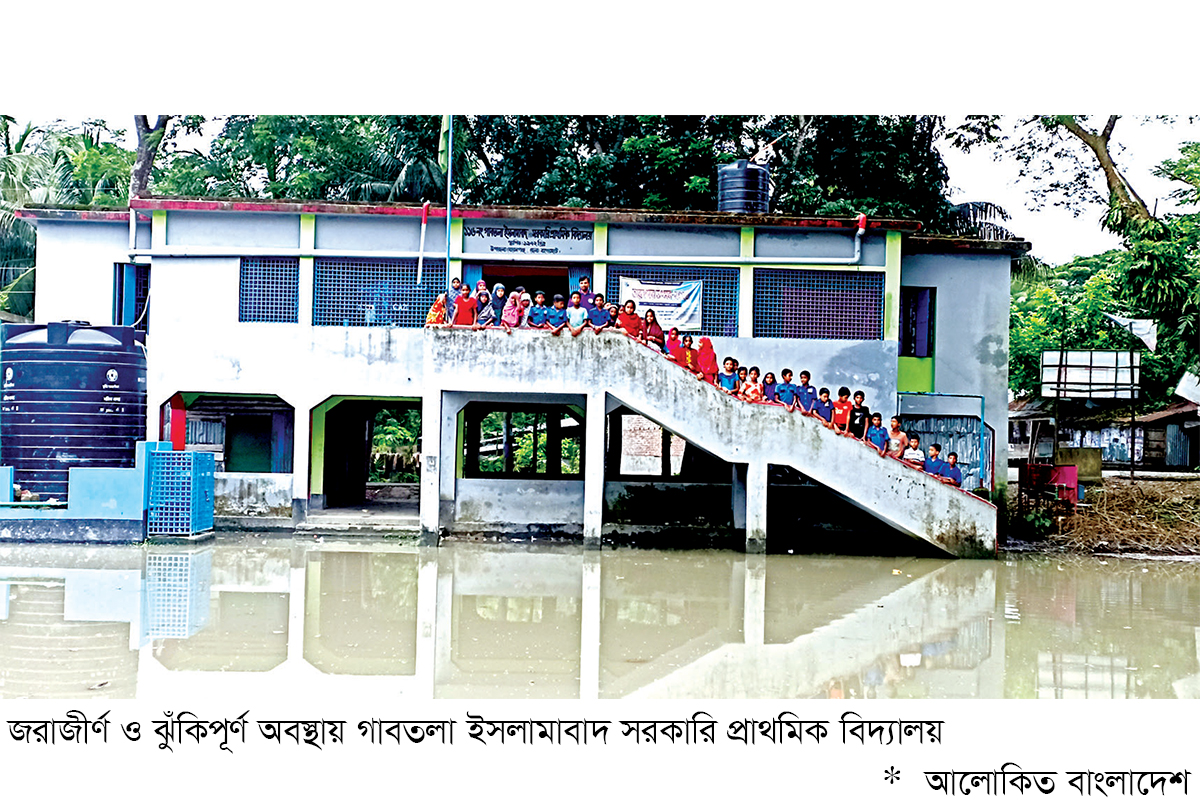 বাগেরহাটের মোরেলগঞ্জে ১১৬নং গাবতলা ইসলামাবাদ সরকারি প্রাথমিক বিদ্যালয়ের মাঠে মাসের অর্ধেক সময় থাকে হাঁটু পানি। প্রতিনিয়ত এ পানি পেরিয়ে শিক্ষার্থীদের যেতে হয় ক্লাসের পাঠদানে। স্কুল টু সাইক্লোন শেল্টার ভবনটিও ঝুঁকিপূর্ণ। স্থানীয় অভিভাবকদের দাবি, বিদ্যালয়ের মাঠ ভরাটসহ নতুন ভবন নির্মাণের।
