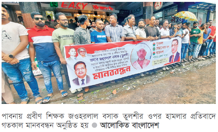 পাবনা সরকারি এডওয়ার্ড কলেজের অবসরপ্রাপ্ত প্রবীণ শিক্ষক জওহরলাল বসাক তুলশীর ওপর হামলা এবং তাকে কুপিয়ে আহত করার প্রতিবাদে মানববন্ধন করেছে জেলা যুবদল, স্বেচ্ছাসেবক ও ছাত্রদলের নেতাকর্মীরা। গতকাল মঙ্গলবার শহরের প্রধান সড়ক আব্দুল হামিদ রোড়ে প্রেসক্লাবের সামনে মানববন্ধন কর্মসূচি চলাকালে বক্তব্য দেন, জেলা বিএনপির যুগ্ম আহ্বায়ক সাবেক ছাত্রনেতা নুর মোহাম্মদ মাসুম বগা, জেলা যুবদলের আহবায়ক হিমেল রানা, স্বেচ্ছাসেবক দলের আহ্বায়ক ইয়ামিন খান জেলা, জেলা স্বেচ্ছাসেবক দলের সদস্য সচিব কমল শেখ টিটু, সাবেক সাধারণ সম্পাদক মাসুদ রানা, যুগ্ম আহ্বায়ক দীপংকর সরকার জিতু, ছাত্রদলের সাংগঠনিক সম্পাদক সাদ্দাম হোসেন, ছাত্রদল সরকারি এডওয়ার্ড কলেজ শাখার সহ-সভাপতি শরিফুল ইসলাম, সরকারি শহিদ বুলবুল কলেজ শাখার সাবেক সভাপতি গোলাম জাহিদ রুপপসহ অনেকে।