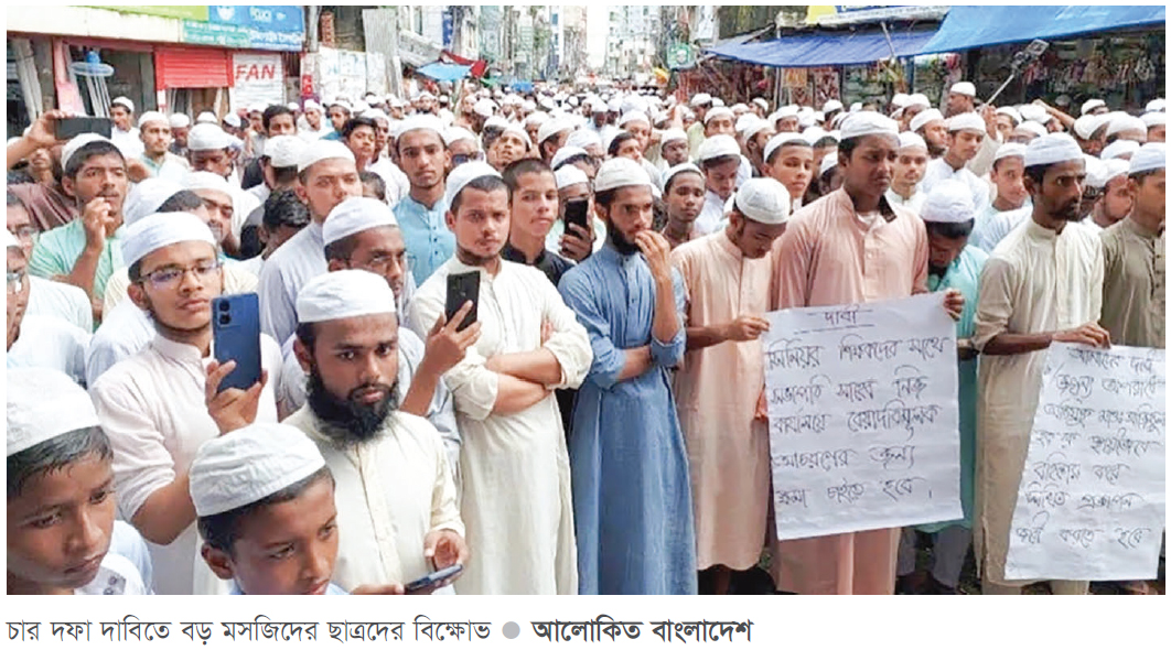 ময়মনসিংহে শিশু বলৎকারকারী মাদ্রাসা শিক্ষকের স্থায়ী বহিষ্কার, শিক্ষকদের সঙ্গে মাদ্রাসার পরিচালনা কমিটির সভাপতির অসৌজন্যমূলক আচারণের জন্য ক্ষমা প্রার্থনা, শিক্ষকদের বেআইনিভাবে বহিস্কারের পাঁয়তারা বন্ধের দাবিতে মাদ্রাসা শিক্ষার্থীরা দ্বিতীয়বারের মতো ৪ দফা দাবিতে নগরীতে সমাবেশ ও মিছিল করেছেন। গতকাল মঙ্গলবার নগরীতে তারা সমাবেশ কর্মসূচি পালন করেন। দাবি আদায়ে গত কয়েক দিন থেকেই তারা কর্মসূচি পালন করে আসছেন। গত ২৬ জুলাই আন্দোলনকারীরা নগরীর জুবিলীঘাট-কালী সড়ক প্রায় ৪ ঘণ্টা অবরোধ করেন। তাদের দাবি হলো- মাওলানা আজিজুল হককে স্থায়ীভাবে বহিষ্কার করা এবং লিখিত প্রজ্ঞাপন জারি করা। গত বুধবার ২৩ জুলাই মাদ্রাসার ওস্তাদদের সঙ্গে অসৌজন্যমূলক আচরণ করার দায়ে জেলা প্রশাসককে প্রকাশ্যে মাদ্রাসা প্রাঙ্গণে এসে ক্ষমা চাওয়া। মাদ্রাসার ওস্তাদ নিয়োগের ক্ষেত্রে কমিটির কর্তৃপক্ষ একক সিদ্বান্ত নিতে পারবে না, মুরব্বিদের সঙ্গে পরামর্শ করতে হবে। যাদের পদ থেকে বহিষ্কার করা হয়েছে তাদেরকে পুর্নবহাল করতে হবে। আন্দোলনকারীদের দাবি ময়মনসিংহের ঐতিহ্যবাহী জামিয়া ফয়জুর রহমান (রহ.) বড় মসজিদ, মাদ্রাসার শিক্ষক মাওলানা আজিজুল হকের বিরুদ্ধে শিশু বলৎকার এবং অর্থ আত্মসাতের অভিযোগ ছিল, যার কারণে তাকে বহিষ্কার করা হয়। কিন্তু মাদ্রাসার পরিচালনা কমিটির সভাপতি হিসেবে জেলা প্রশাসক (ডিসি) মো. মুফিদুল আলম একটি তদন্তের পর সেই বহিষ্কারাদেশ প্রত্যাহার করে নেন। একই সঙ্গে, তিনি মাদ্রাসার অন্য দুজন শিক্ষক মুফতি মোফাজ্জল হক ও মুফতি সারোয়ার হোসেনকে পদ থেকে সরিয়ে দেন। ডিসির এই সিদ্ধান্তের প্রতিবাদে গত শনিবার সকালে শিক্ষার্থীরা রাস্তায় নেমে বিক্ষোভ শুরু করে।
