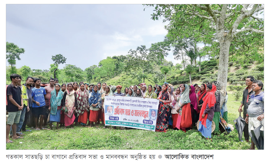 ন্যাশনাল টি কোম্পানি লিমিটেডের ওপর মিথ্যা ও ভুয়া সংবাদ প্রচারের বিরুদ্ধে হবিগঞ্জ জেলার চুনারুঘাট উপজেলার সাতছড়ি চা বাগানে প্রতিবাদ সভা ও মানববন্ধন অনুষ্ঠিত হয়েছে। গতকাল বুধবার দুপুরে সাতছড়ি চা বাগানে এ প্রতিবাদ সভা ও মানববন্ধন অনুষ্ঠিত হয়। সুবিচারের দাবিতে এ অনুষ্ঠান আয়োজন করে সাতছড়ি চা বাগানের শ্রমিক, কর্মকর্তা ও কর্মচাররা। এতে বক্তব্য রাখেন- জীবন নায়েক, অর্চনা রাণী তাতী, গোলাপ তাতী, রবিন মুন্ডা, প্রীতি উড়াং, সুমন তাতী প্রমুখ। সভা ও মানববন্ধন শেষে শ্রমিকরা এক বিক্ষোভ মিছিল বের করেন। মিছিলটি বাগানের বিভিন্ন স্থান প্রদক্ষিণ করে।